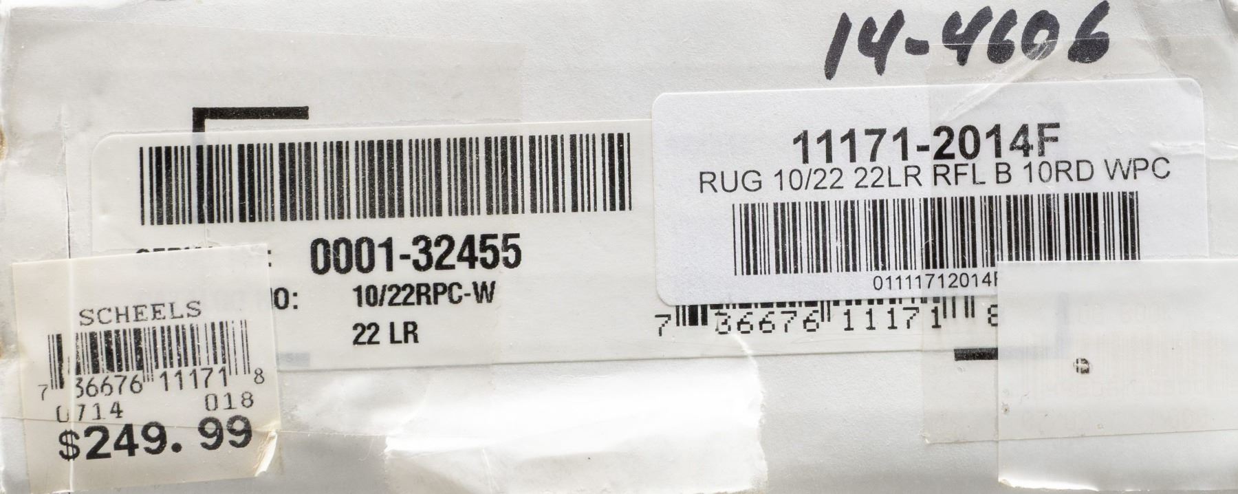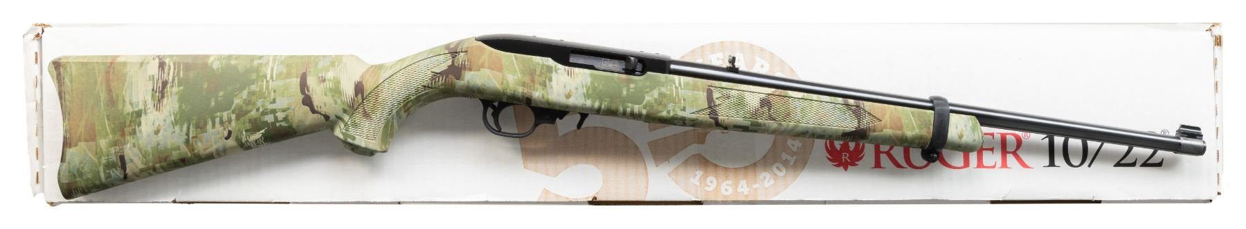 1) TALO EXCLUSIVE, WOLF CAMO. S# 0001-32455. Shipped 2014 as Catalog # 10/22RPC-W; Model 11171. Wolf camo pattern synthetic stock w/ barrel band. MAGS: 1 BX-10 rd. mag. UNATTACHED ACCESSORIES: matching factory box containing Ruger paperwork. CONDITION: as NIB. (24-3062/MD).
