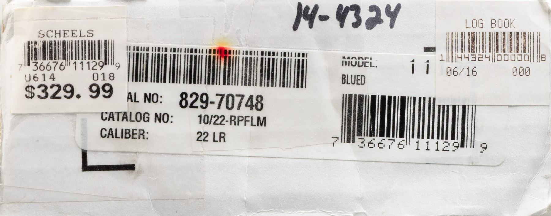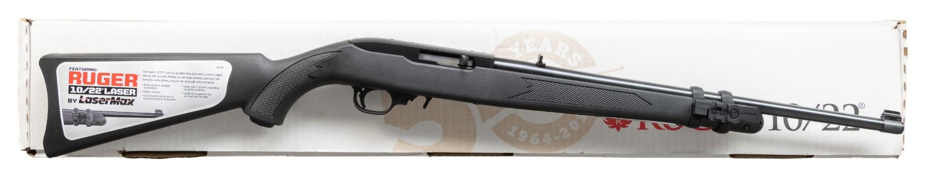 2) LASERMAX. S# 829-70748. Mfg. 2013 only, shipped 2014 as Catalog # 10/22-RPFLM; Model # 11129. Band mounted black synthetic stock has integral Lasermax laser & 2 barrel bands has 2 accessory rails. MAGS: 1 BX-10 rd. mag. UNATTACHED ACCESSORIES: matching factory box containing Ruger paperwork, lock & rail. CONDTION: AS NIB w/ factory sticker on forearm. (24-3479/MD). ALL MODERN. $500-700.