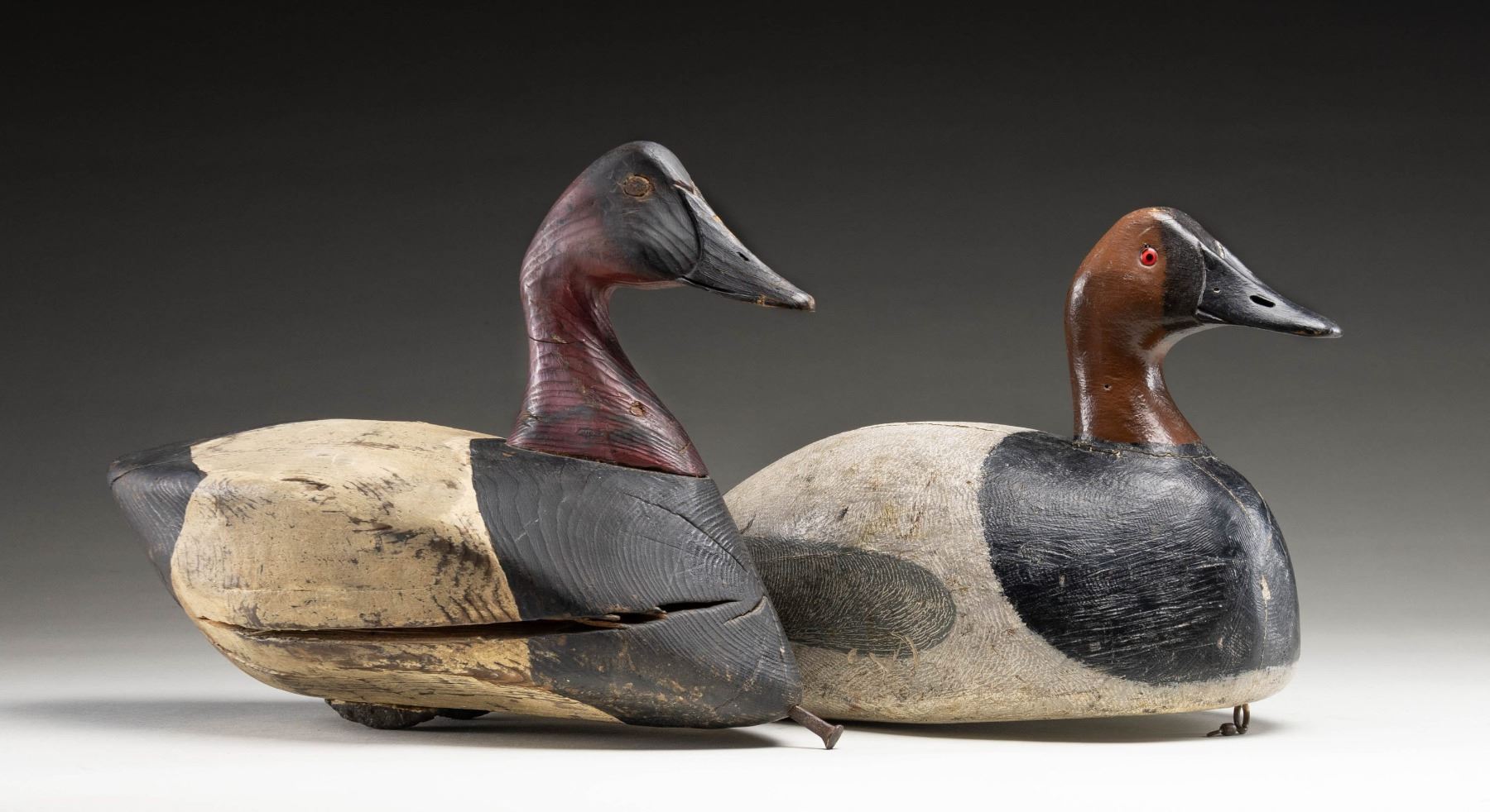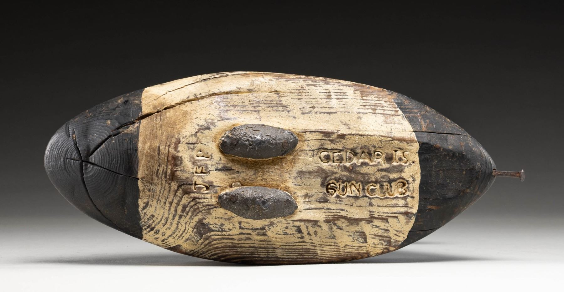 IS GUN CLUB". 1) Oversized canvasback 18" solid bodied with distinctive point to breast with protruding nail, tack eyes and nicely carved head detail. Bottom with two lead weights deeply branded "CEDAR IS." "GUN CLUB" and "JFP". CONDITION: original worn paint deeply cracked on right side. 2) Oversized canvasback 19" solid bodied with glass eyes. CONDITION: old probably original paint with some chips and cracks. PROVENANCE: From the Private Collection of Berrien Moore III. (02-25872-5/MGM). $300-500.
