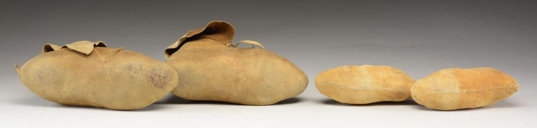 1) 10" sparse seed bead trim, small paper tags on each "Blackfoot". 2) 6.5" petite slippers, soft deerskin, sinew & thread sewn, green trade cloth trim, "G. E. FREDERICK" inked on one. CONDITION: good, only some beading remains on Blackfoot pair but leather sound & supple, trade cloth on other pair has insect damage, stained. PROVENANCE: Martin Lane Historic & Western Americana Lifetime Collection. (02-21684/JS). $400-500.
