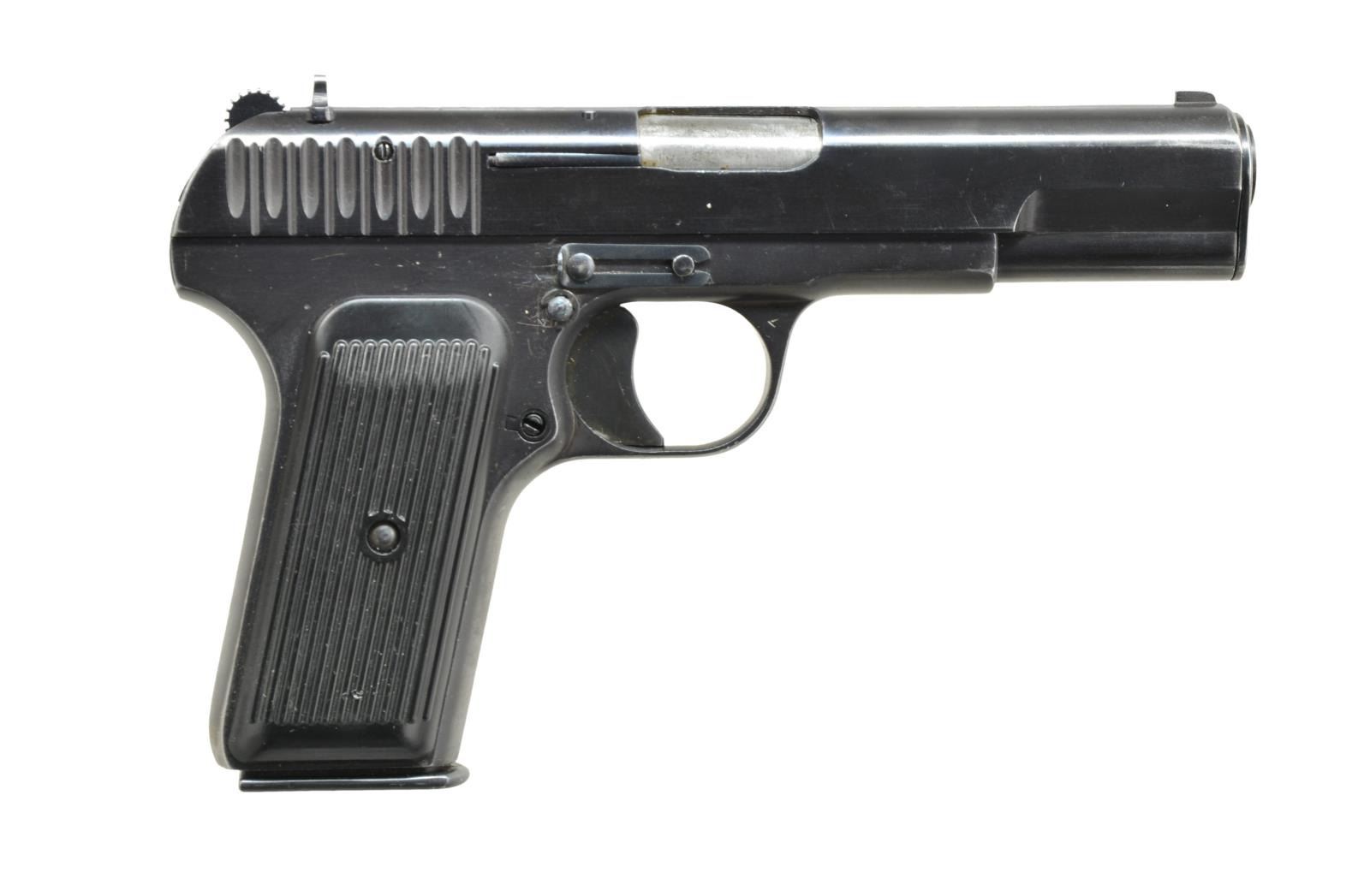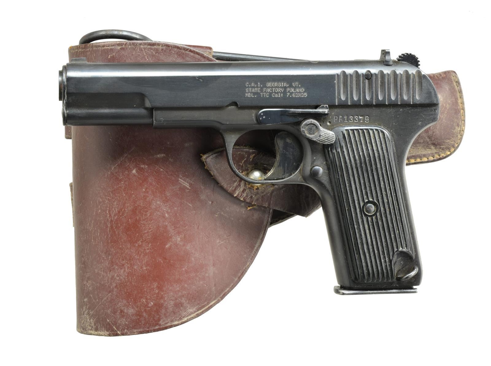 ALL: cal. 7.62x25. Bbls. 4 1/2". Fixed sights. 1) Z.M. LUCZNIK MODEL TT. S# G7694. Import marked on left side of slide "PW ARMS REDMOND WA MODEL TT 7.62x25mm Z.M. LUCZNIK POLAND". Slide is marked on top w/ triangular "FB" Radom logo & dated 1949. Has added side safety behind trigger. Brown composite grips w/ thumb rest. MAGS: 2 - 8 rd. mags. UNATTACHED ACCESSORIES: brown leather holster w/ mag. pouch & cleaning rod. Holster has wear & scuffing, but appears serviceable. CONDITION: very good grips w/ several tiny missing chips. Metal has 85% arsenal rework blue finish w/ light wear & scattered scratches. Bore has strong lands, but turning dark in grooves. (21-831/RW) 2) MODEL TTC. S# PA13379. Slide is marked on left side "C.A.I. GEORGIA, VT. STATE FACTORY POLAND MDL. TTC Cal: 7.62x25". Slide is marked on top w/ encircled "11" & dated 1952. Has added thumb safety on left side behind trigger guard. Brown composite grips w/ vertical grooves. MAGS: 2 - 8 rd. mags. UNATTACHED ACCESSORIES: brown leather holster w/ mag. pouch & cleaning rod. Holster has wear & flexing, but in good condition. CONDITION: grips have good appearance w/ light overall wear & notable missing chip on top right side. Pistol retains 80% arsenal rework blue finish w/ light wear, scattered scratches & sm. spots of finish loss. Safety has loss of finish & tiny dents on thumb lever. Good shiny bore w/ strong lands. (21-835/RW). ALL CURIO. $400-600.