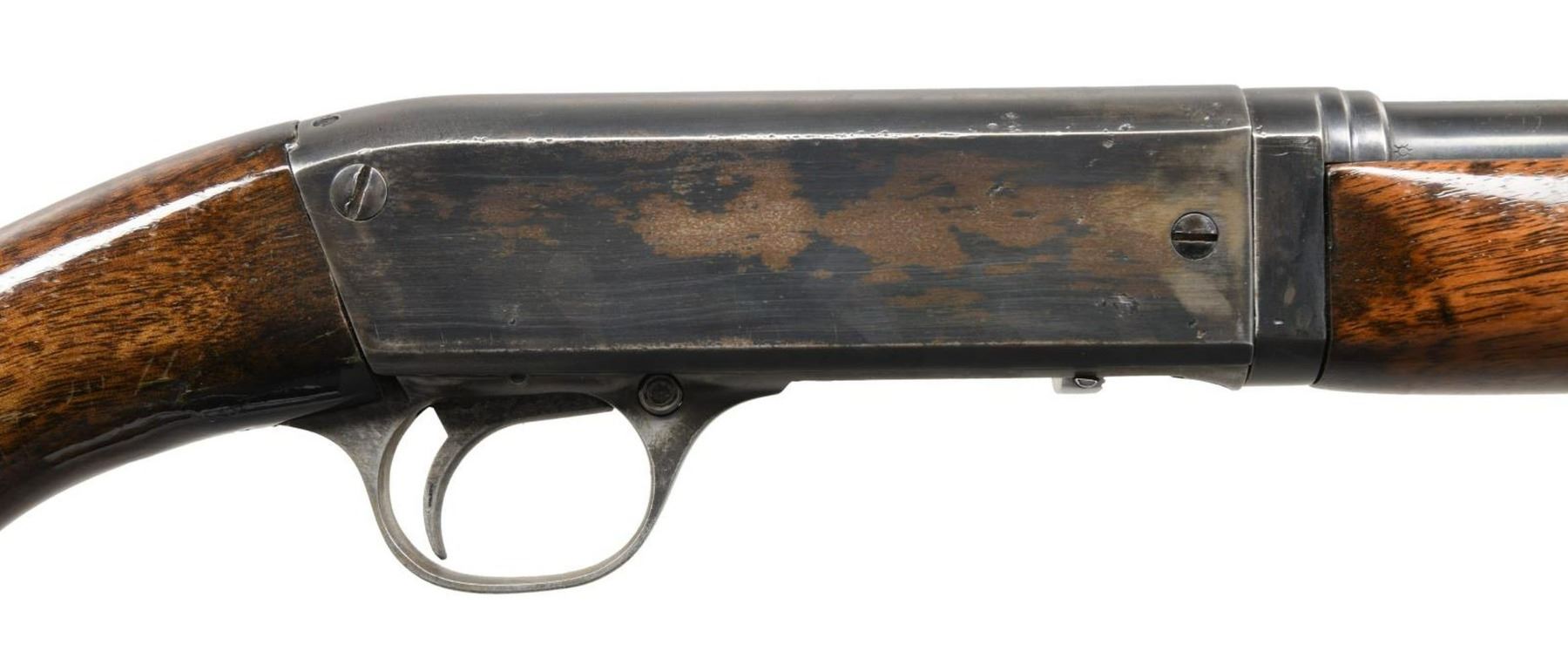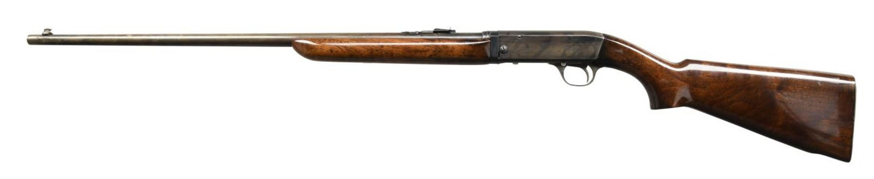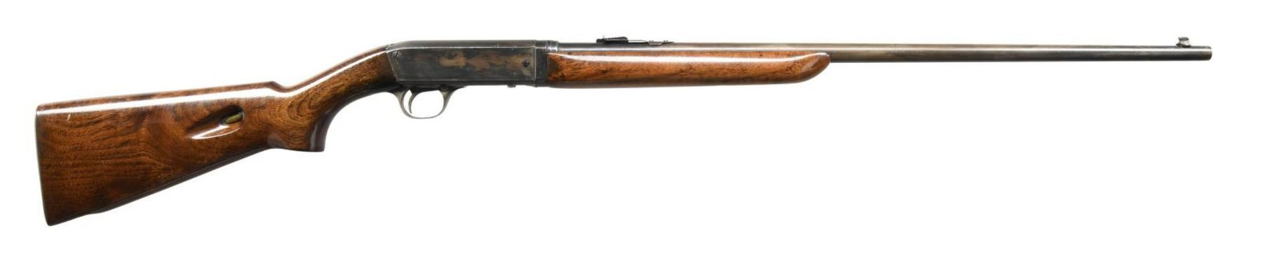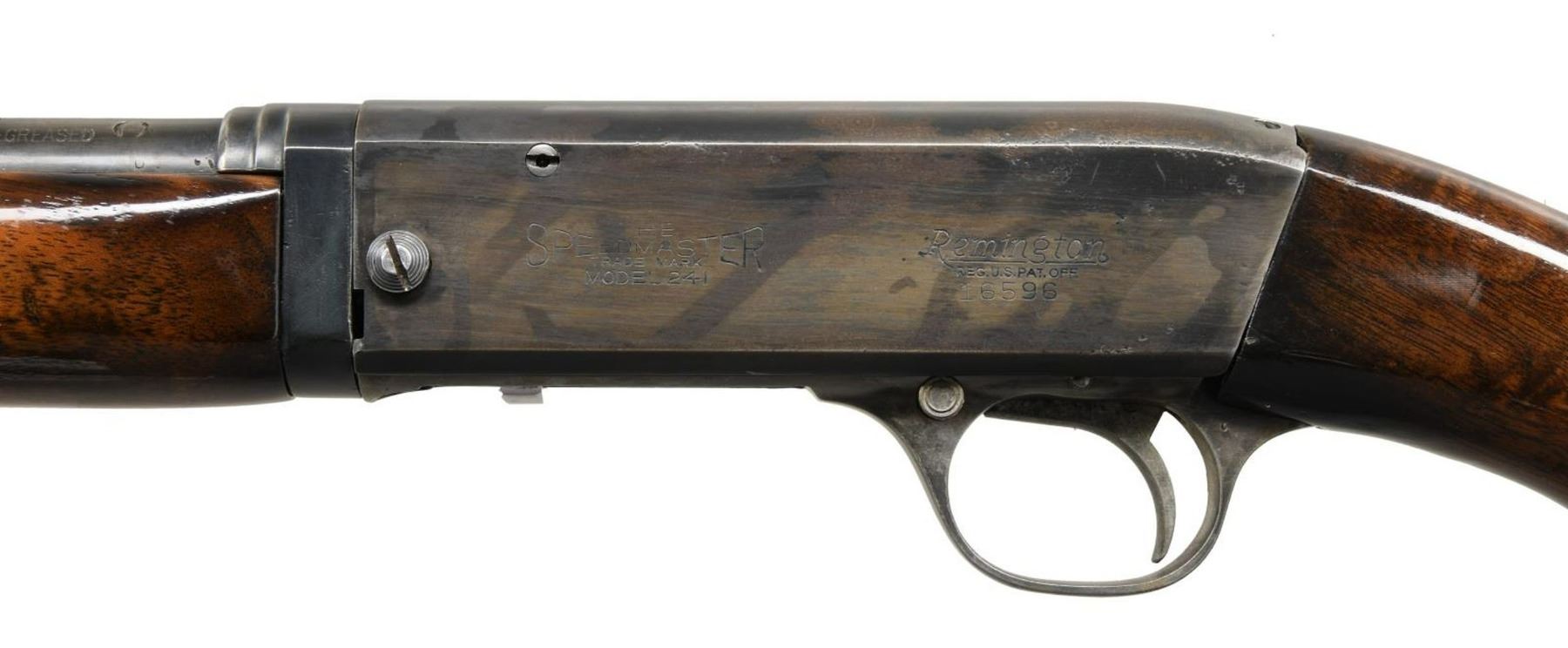 1) MODEL 241 TAKEDOWN. Cal. 22 LR. S# 16596. Bbl 24". Model 241 takedown semi-automatic rifle manufactured by Remington. The top of the bbl. is marked with Remington's 2 line address, with the cal. designation on the left at the breech. The left side of the receiver is marked "THE/ SPEEDMASTER/ TRADE MARK/ MODEL 241", followed by the stylized Remington logo above the serial number. Metal components exhibit a reapplied blue finish. Plain smooth wood buttstock and forend have been sanded and revarnished. Blade front sight with U-notch rear sight. CONDITION: metal components retain little of their reapplied blue finish, exhibiting wear and thinning overall that shows through to brown patina, with some scattered areas of pitting. Bright bore, exhibiting good rifling throughout. Wood furniture is very good as sanded and revarnished, exhibiting some scattered marks from handling and storage. (23-4721/MLW). 2) MODEL 16A. Cal. 22 Rem Auto. S# 3425. Bbl 22". Model 16A semi-automatic rifle manufactured by Remington. The top of the bbl is marked with Remington's 2 line address, with the Remington trademark logo and cal. designation stamped at the breech. Metal components exhibit a blued finish. Plain wood straight grip buttstock with schnabel tip forend. Blade front sight with V-notch rear sight. CONDITION: metal components retain traces of their original factory blue finish, exhibiting wear and thinning overall that shows through to gray and brown patinas. Bright bore, exhibiting some pitting and good rifling throughout. Wood furniture exhibits some scattered marks from handling and storage, with a small crack on the toe of the butt. (23-4722/MLW). ALL CURIO. $350-550.