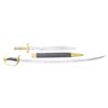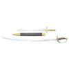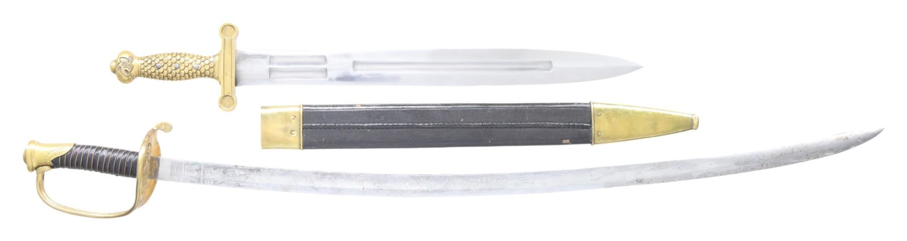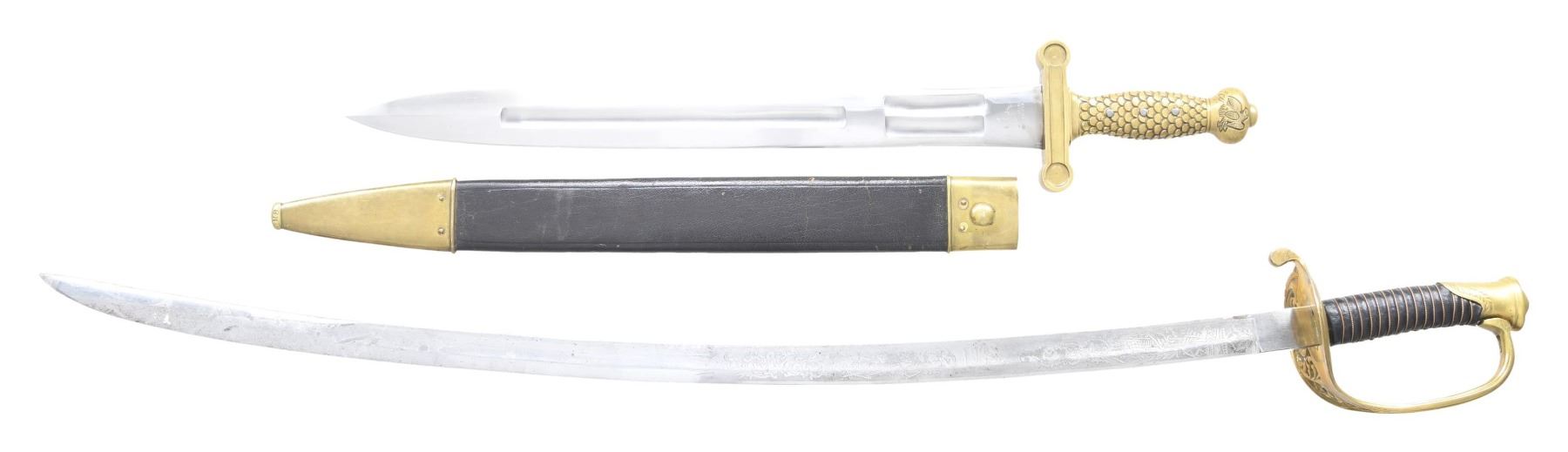 1) CAVALRY. A non-regulation Cavalry officer's saber of a Civil War style measuring 40" overall with a 34" curved blade. The etched blade is marked "INDIA" on the ricasso. Brass hilt and wire wrapped leather grip and no scabbard. CONDITION: light wear. 2) ARTILLERY. An M1832 Artillery short sword with a plain blade having 1 long and 2 short fullers. The blade has faux marks near the solid brass hilt, Hilt displays an eagle decorated pommel and more faux marks. Brass mounted leather scabbard. CONDITION: light wear. (02-24493-3/BF). $200-300.