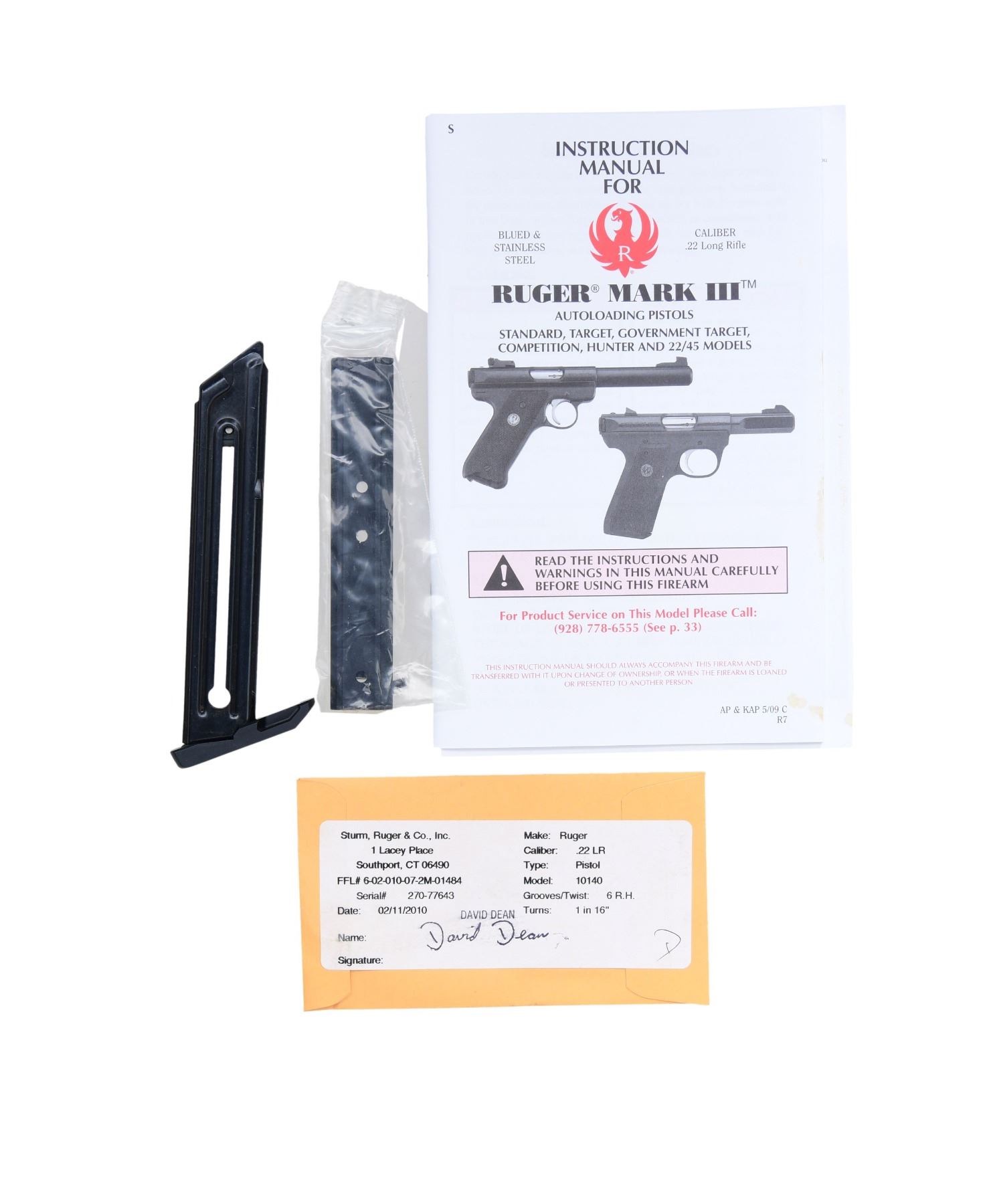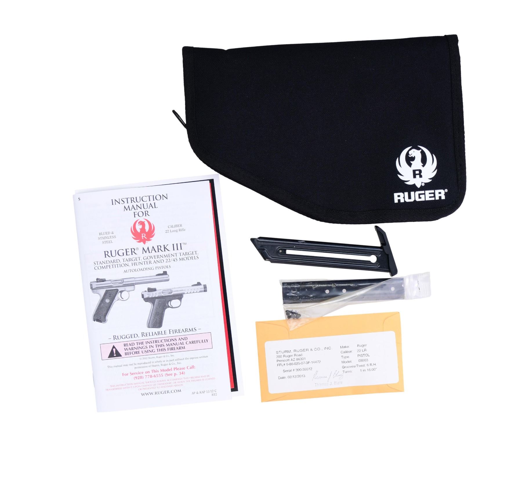 1) MARK III 22/45 LITE WITH MATCHING NUMBERED BOX. Cal. 22 LR S# 390-35512. Mfg. 2013 as Model 03903 & Catalog No. P45MK3ALRPFL. Blued finish with 4.5" fluted, threaded barrel. Black polymer checkered grips. MAGS: 2-10 Rds. UNATTACHED ACCESSORIES: Factory box, instruction manual, and additional paperwork. CONDITION: Near excellent condition. Bore is clean with sharp rifling. (24-2894/MD).
