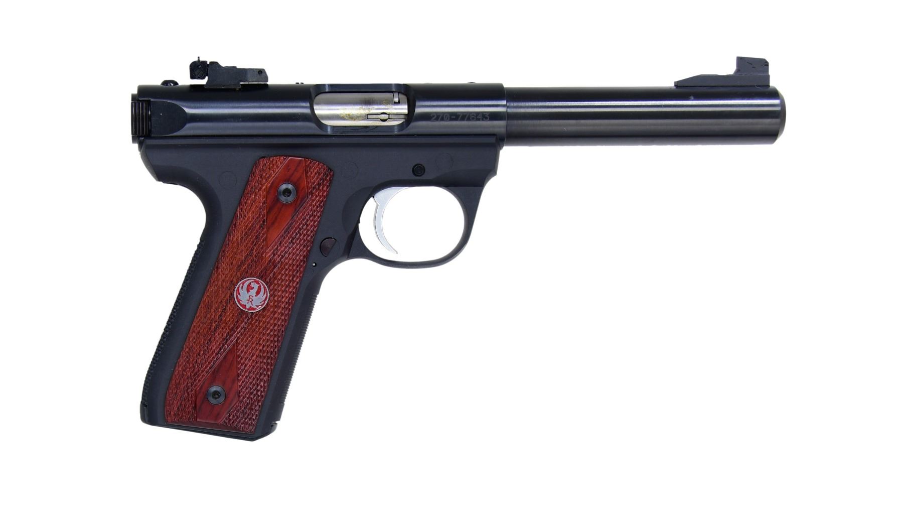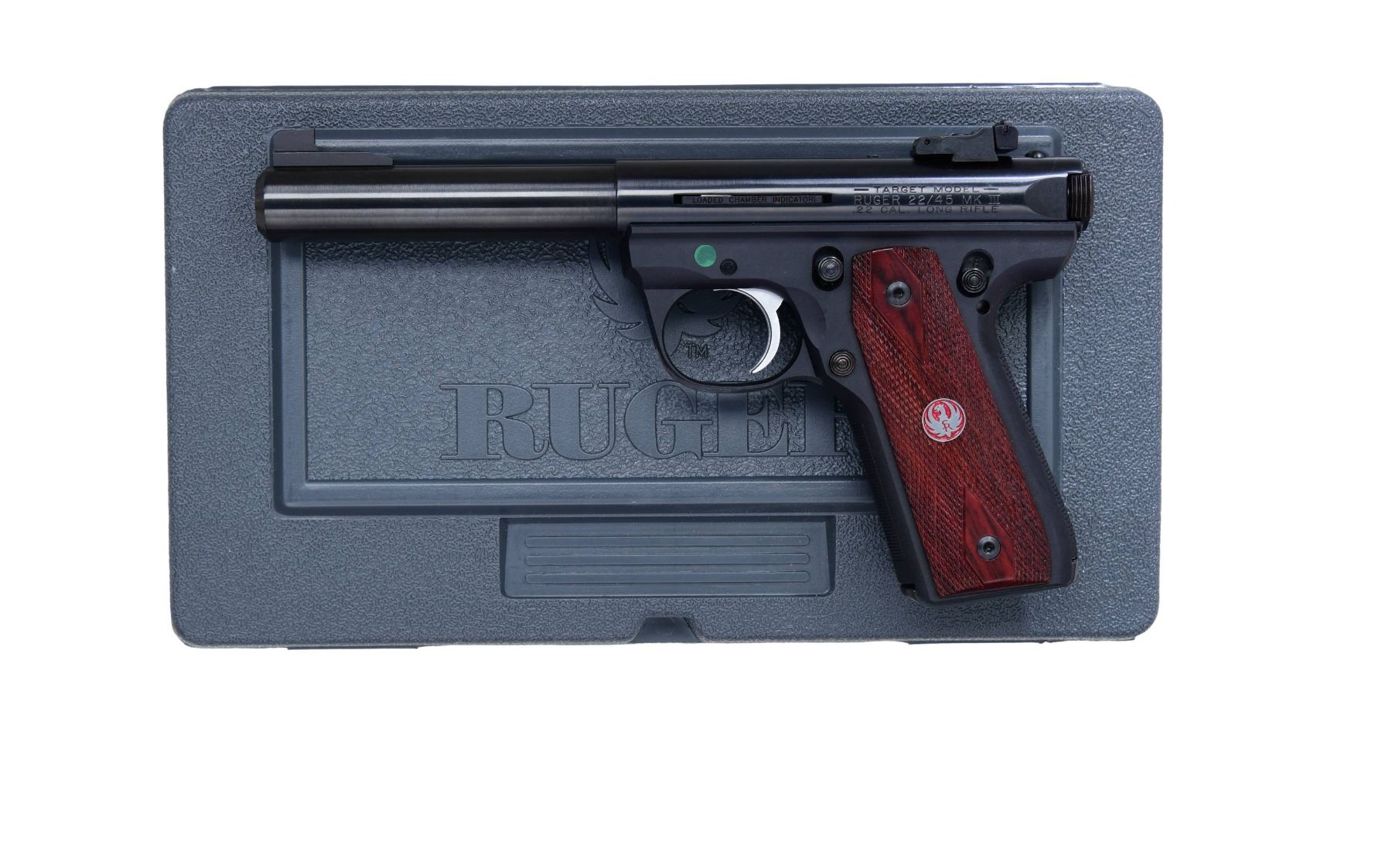 2) 22/45 MARK III TARGET WITH MATCHING NUMBERED BOX. Cal. 22 LR. S# 270-77643. Mfg. 2010 as Model 10140 & Catalog No. P512MKIIIRP. Blued finish. Bbl. 5.5". Fixed front sight & adj. rear sight. Checkered wood grips. MAGS: 2-10 Rds. UNATTACHED ACCESSORIES: Original factory box, manual, and test target. CONDITION: Overall condition is near excellent. The bore is bright and sharp. (24-2942/MD). ALL MODERN. $550-$800.