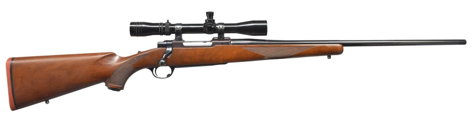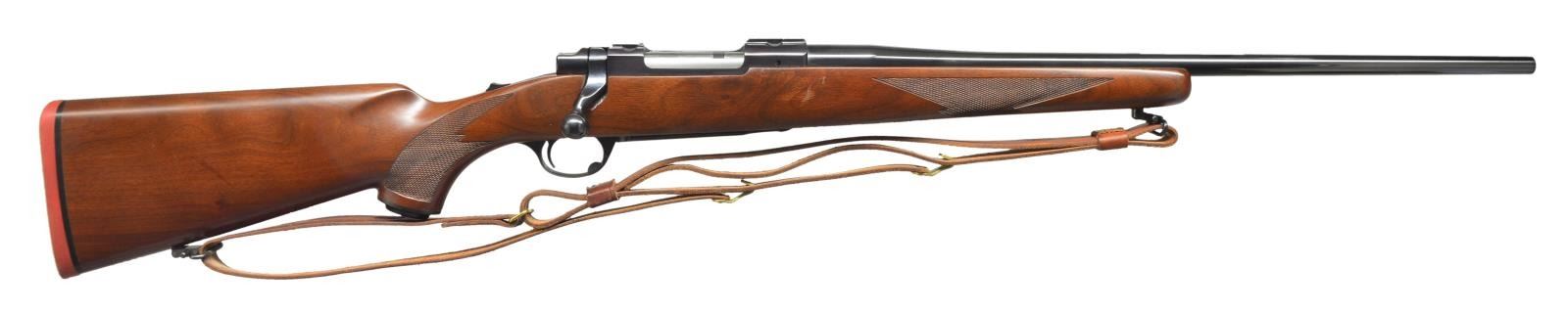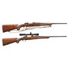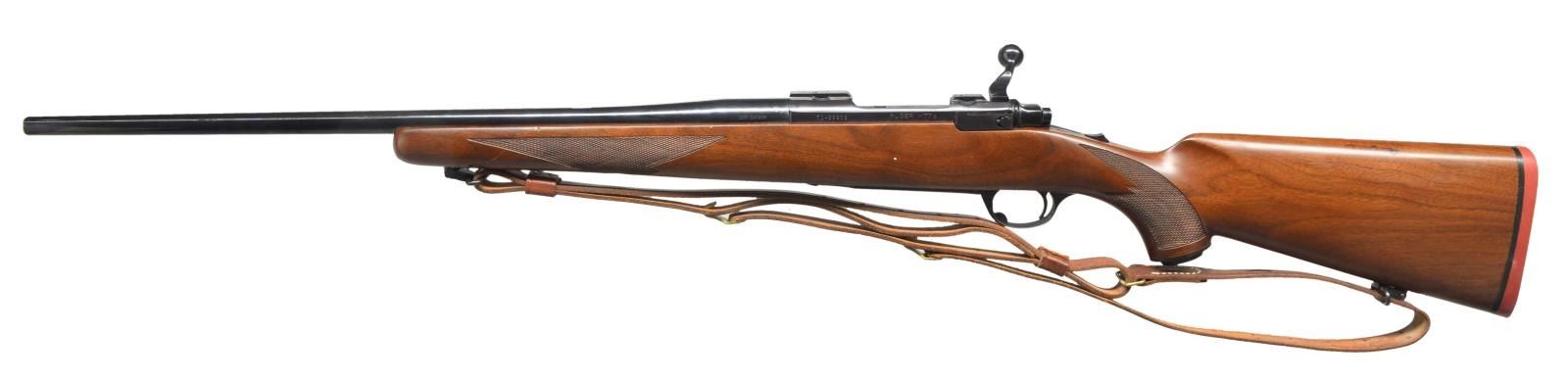 1) Cal. 250 Savage. S# 71-29902. Bbl. 22" tapered rnd. w/out sights. Action features claw extractor, integral scope bases & top tang safety. Straight comb walnut stock w/ cut checkering, plastic grip cap & Ruger solid red pad. Hunter military style leather sling on QD swivels. CONDITION: 98% blue showing sm. scratches & marks on bbl. Original stock finish shows scattered scratches, scrapes & marks. Bright near excellent bore. (21-97/DS). 2) Cal. 220 Swift. S# 73-33147. Bbl. 24" tapered rnd. Action features integral scope bases, claw extractor & top tang safety. Redfield 3x-9x low profile range finding scope w/ gloss finish & duplex reticle on Ruger rings. Straight comb walnut stock w/ cut checkering, swivel bases, plastic grip cap & Ruger solid red pad. CONDITION: bbl. retains 98% blue. Receiver blue is acquiring a purple cast w/ age. Bottom metal shows sm. handling marks. Original stock finish shows numerous sm. scratches & marks w/ a long deep scratch on bottom of forearm. Bright near excellent bore. (21-114/DS). BOTH MODERN. $800-1,200.