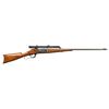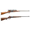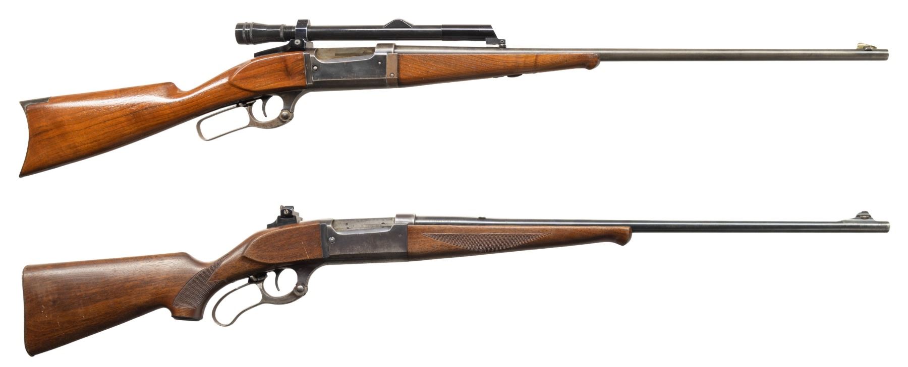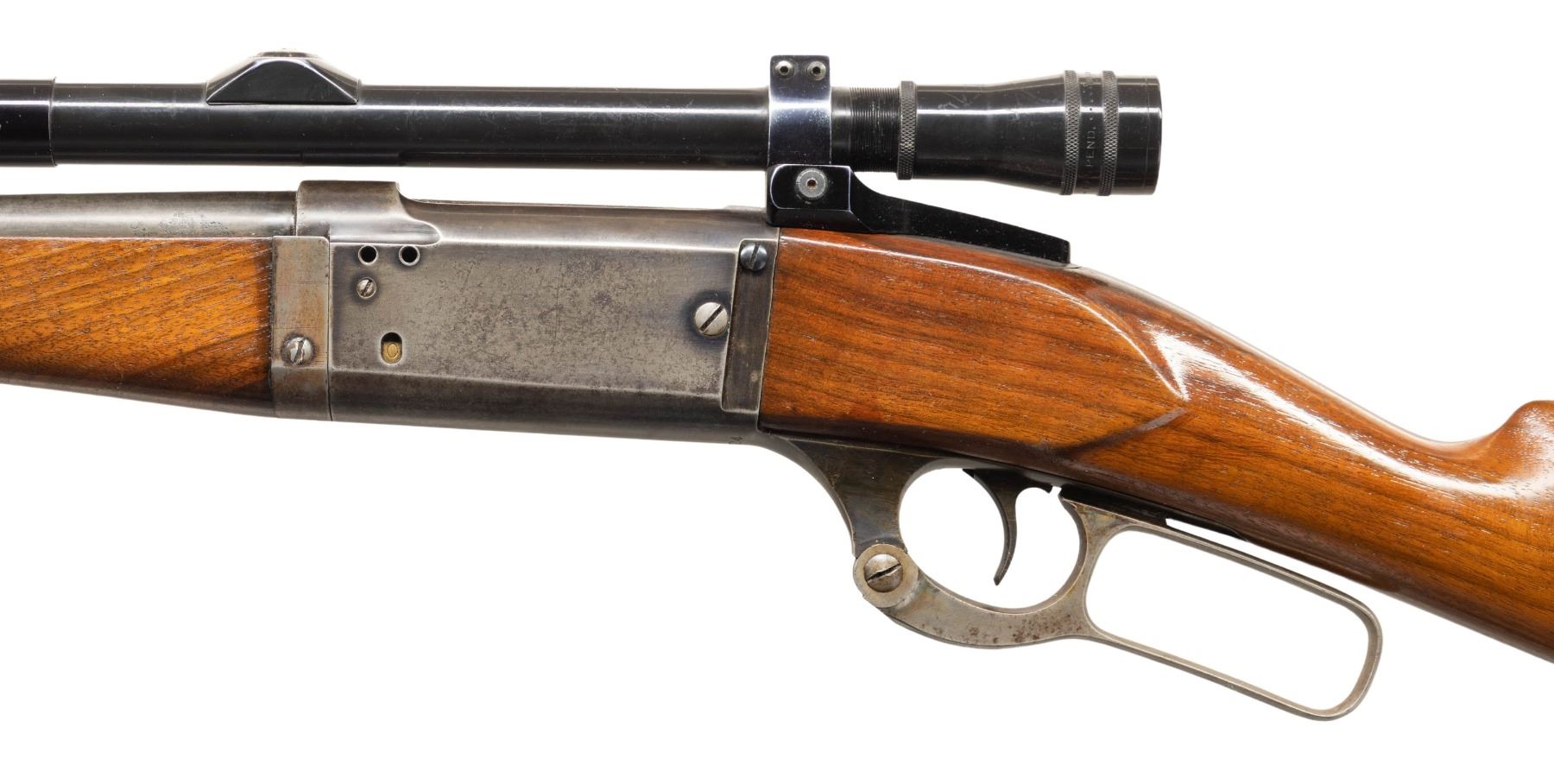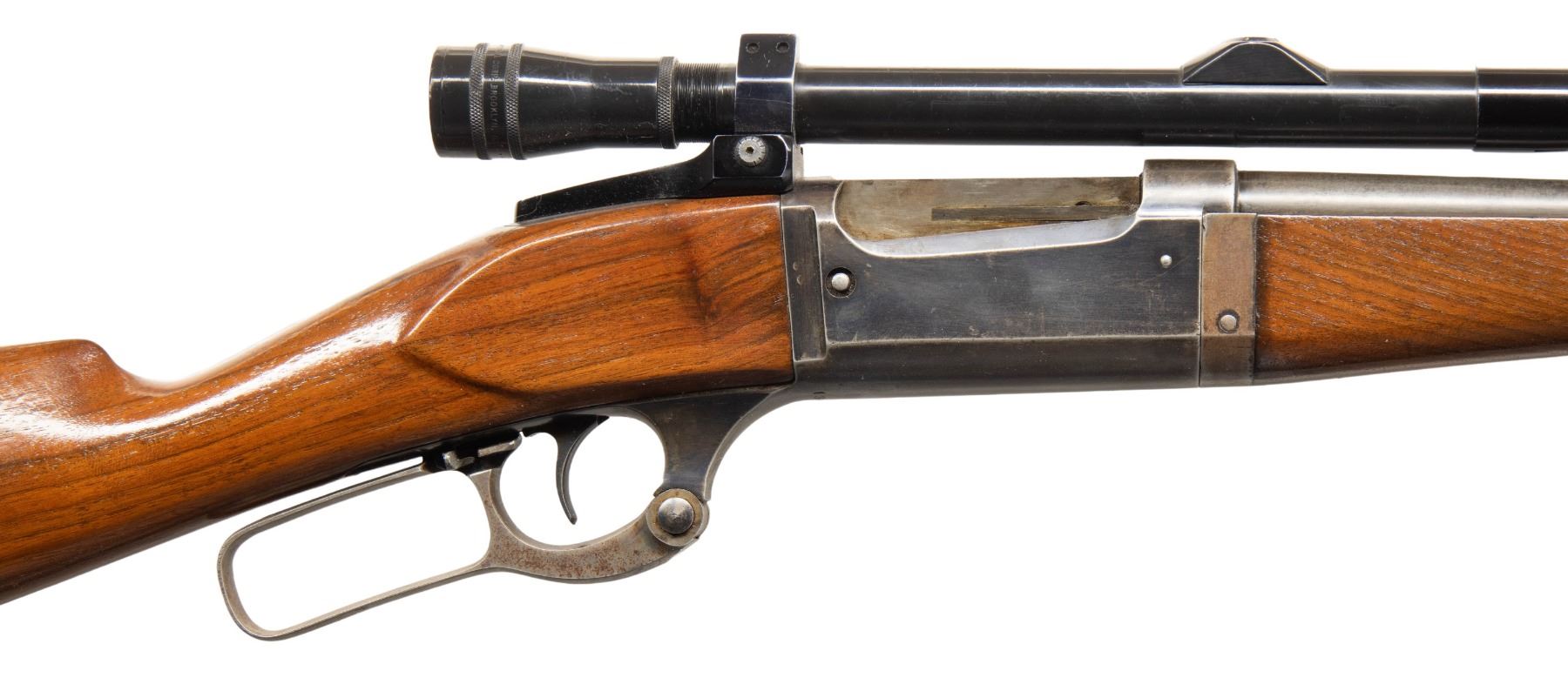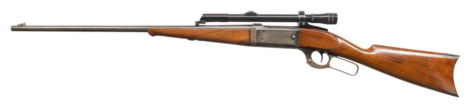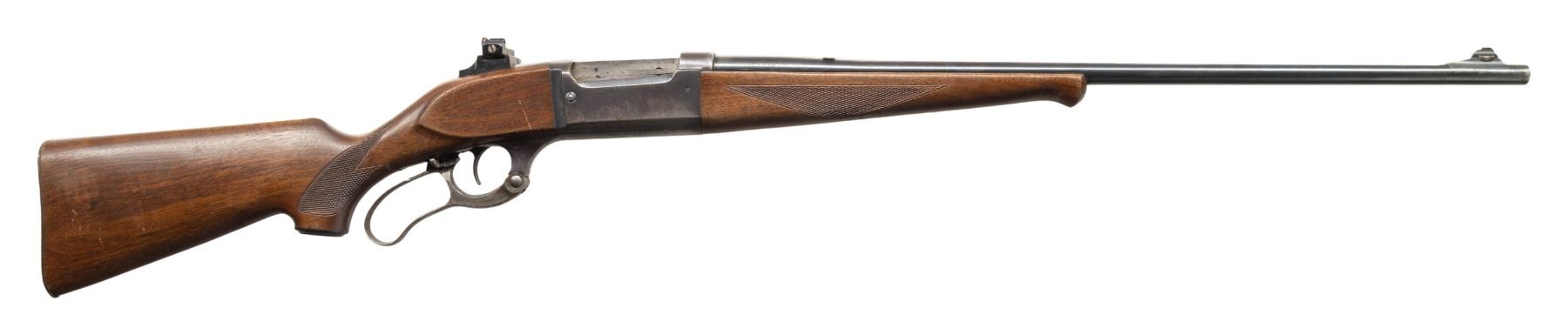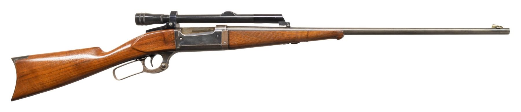 1) MODEL 1899A TD. Cal. 303 Savage. S# 134724 (Mfg. 1913). Tapered 26" bbl. German silver blade front sight; Stith style scope mounts holding Kollmorgen Bear Cub scope. Rotary action has brass cartridge counter, cocking indicator, & sliding safety; 2 additional drilled holes left side chamber for receiver sight. Walnut stock set w/ schnabel tip & crescent buttplate. CONDITION: balance of metal is gray patina with blue on receiver. Sanded & refinished wood w/ plug at toe near buttplate from swivel. Fair worn rifling. (25-5970/MD).