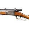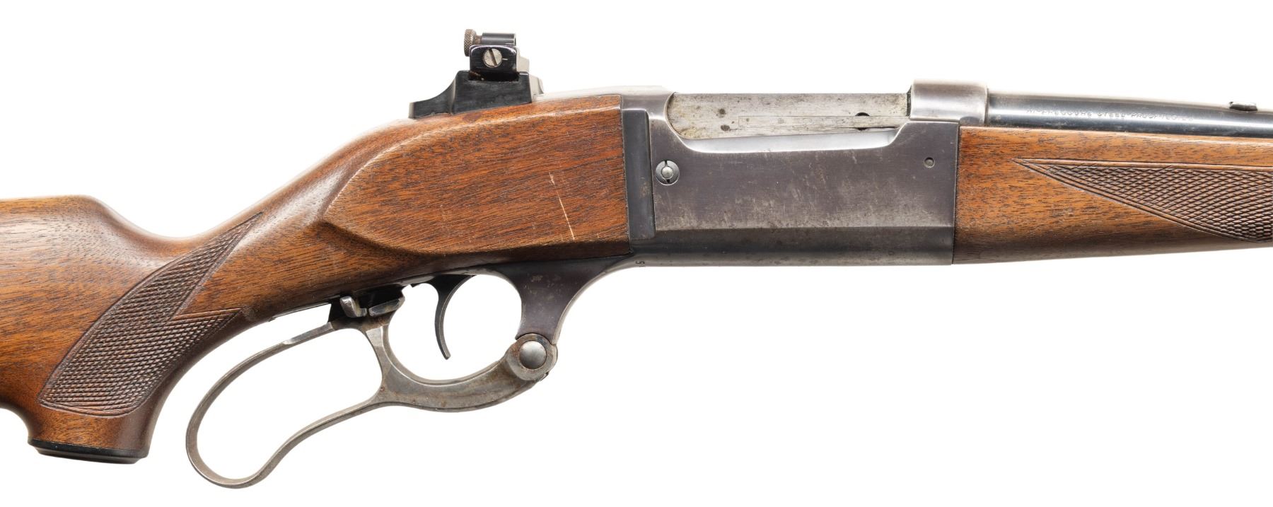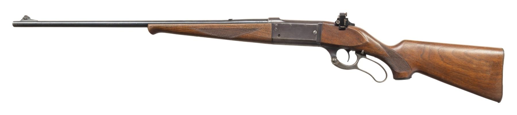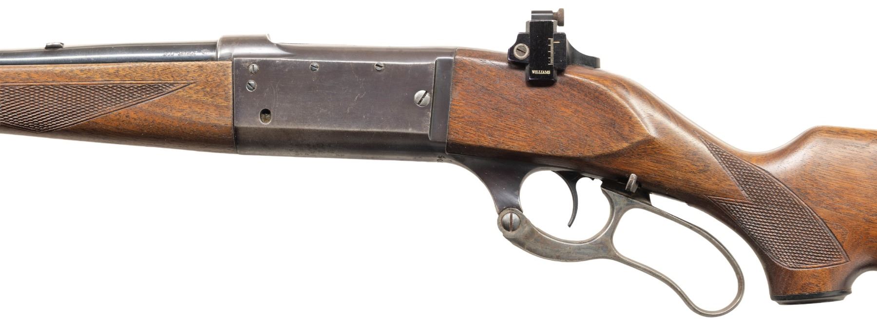 2) MODEL 99EG. Cal. 300 Savage. S# 545035 (Mfg. 1950). Bbl. 24". Blade front sight, filler in rear dovetail & Williams tang sight. Rotary action w/ 3 additional plug screw left side for side mount with standard cartridge counter, cocking indicator & sliding lever safety. Checkered walnut stock set w/ schnabel tip forearm, capped pistol grip buttplate w/ grooved steel buttplate. CONDITION: good barrel blue with spots of finish loss, edge wear & marks. Fair worn receiver blue with peppery oxidation. Very good wood finish with handling marks. Very good rifling with a few dark spots. PROVENANCE: From the PMRB Collection. (25-5971/MD). ALL CURIO. $600-1,000.