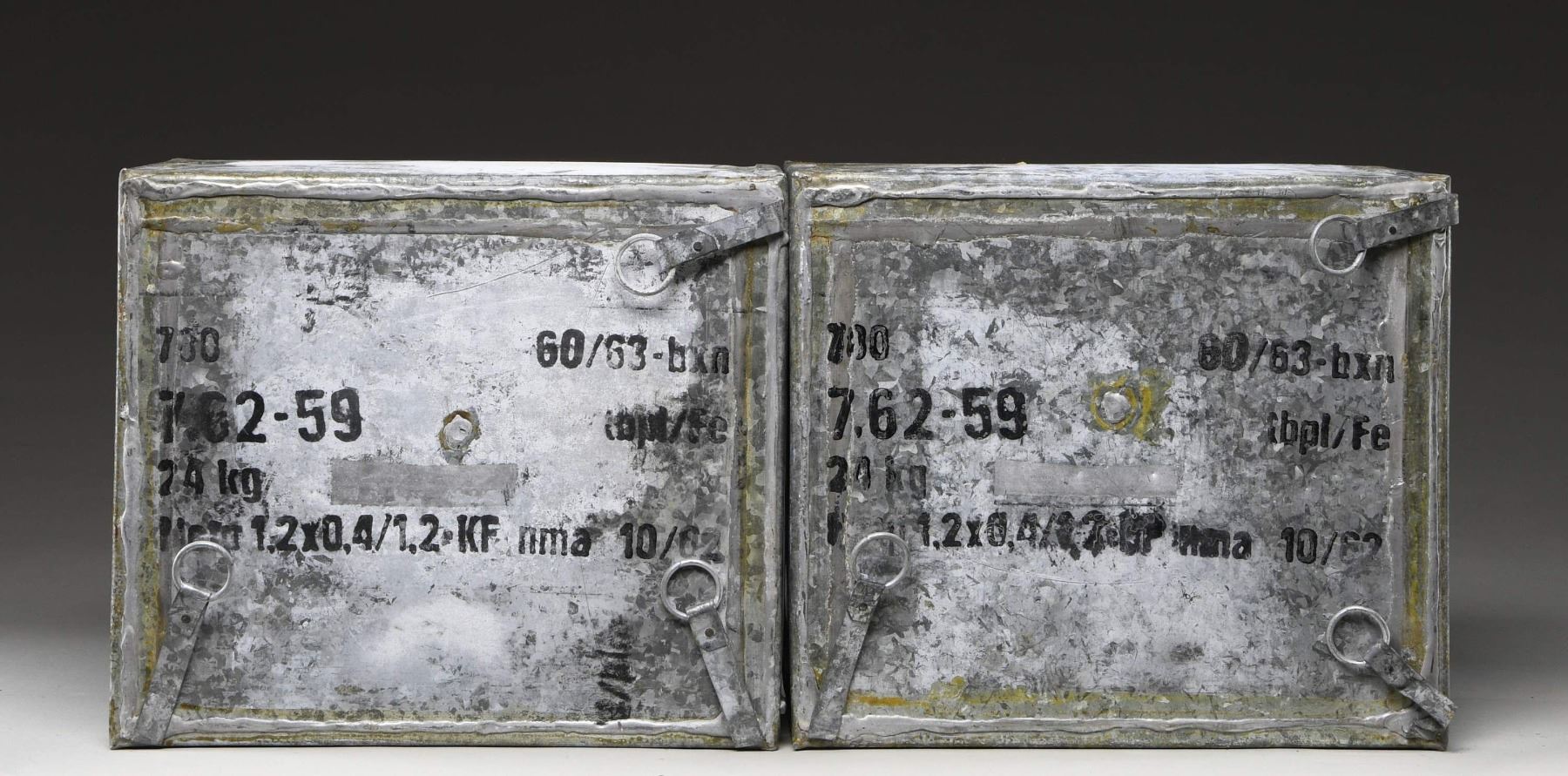 1,560 Rds. of "BXN" steel lacquer case, spitzer boat tail steel core silver tip ammo. CONDITION: cans sealed as is with blue tape & ORDM stickers on outside. (02-24585-1/MD). $500-750.