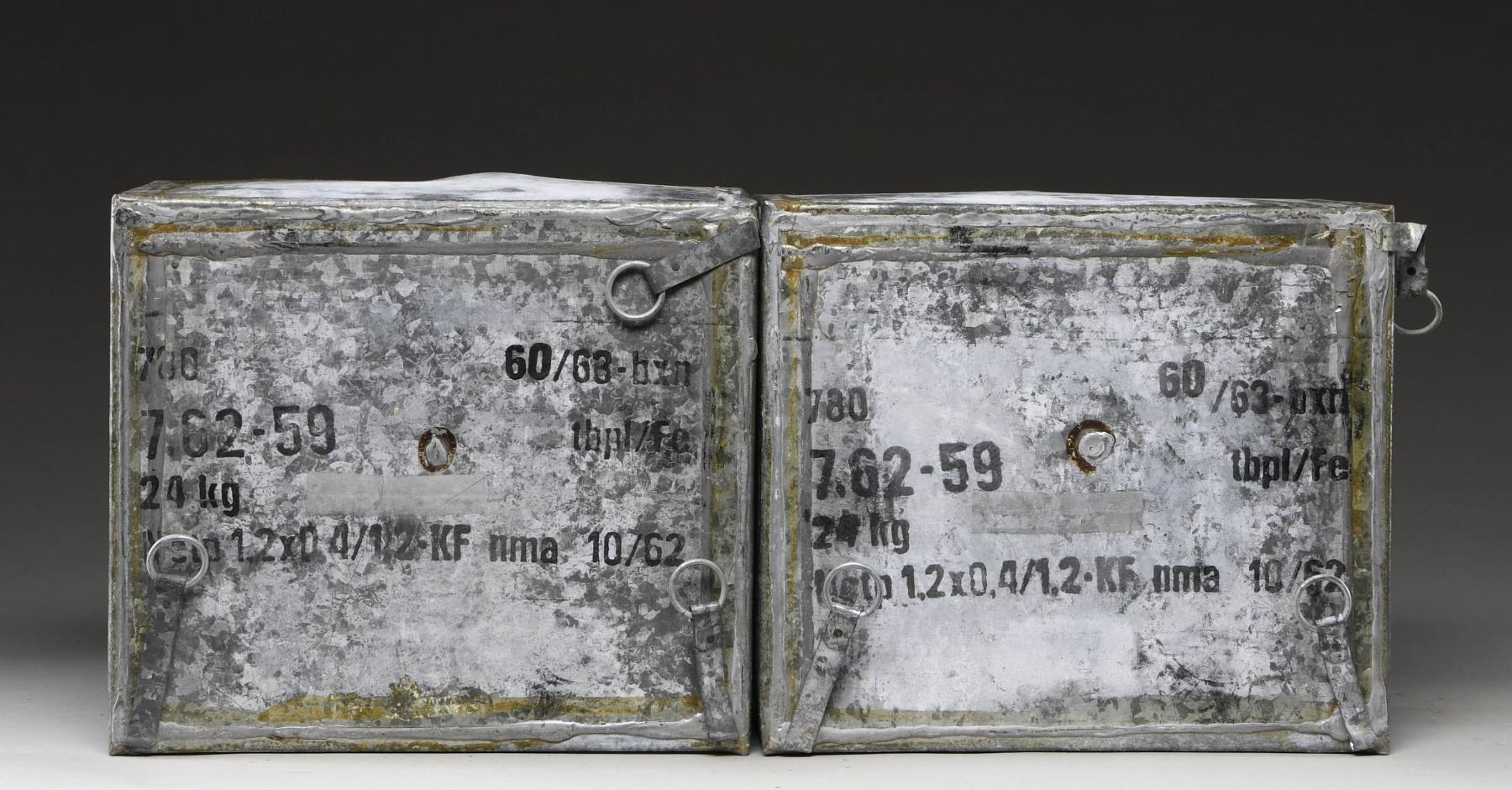 1,560 Rds. of "BXN" steel lacquer case, spitzer boat tail steel core silver tip ammo. CONDITION: cans sealed as is with blue tape & ORDM stickers on outside. (02-24585-2/MD). $500-750.