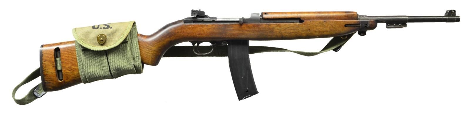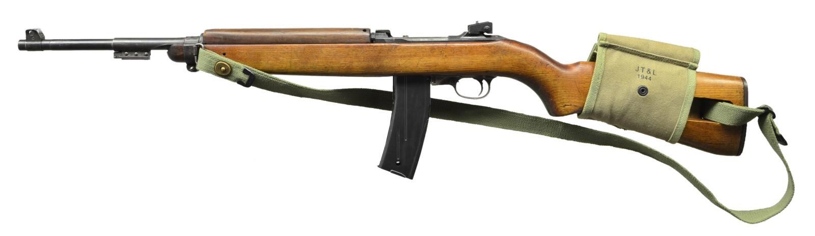 2) INLAND M1 CARBINE. S# 7100516. Bbl. 18". Late issue, mfg. summer 1945 w “INLAND MFG/GENERAL MOTORS DIV/ 1-45” bbl. Unmarked recoil plate, milled “N” front sight & unmarked adjustable rear sight. Early 2 rivet handguard (unmarked), low wall stock “TE” left side w/ no other visible marks. Type III barrel band “EM-Q”, Trigger group “QNL” w/ “II” hammer, round bolt “IO” and op rod appears unmarked. Reproduction web sling, oiler & dual magazine pouch. MAGS: 1-30 rd. CONDITION: metal is a fading/thinning mix of blue/gray patina, stock set has an added coat of finish over dings, dents & shallow gouges. Bore has strong rifling, is bright w/ fine to light scattered pitting. (22-3829/CW). CURIO. $1,000-1,500.