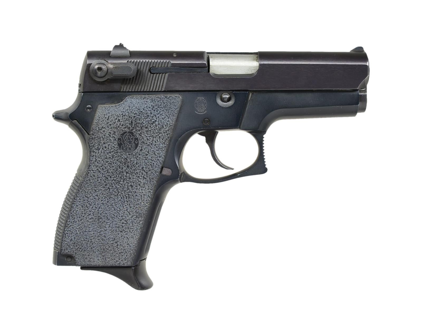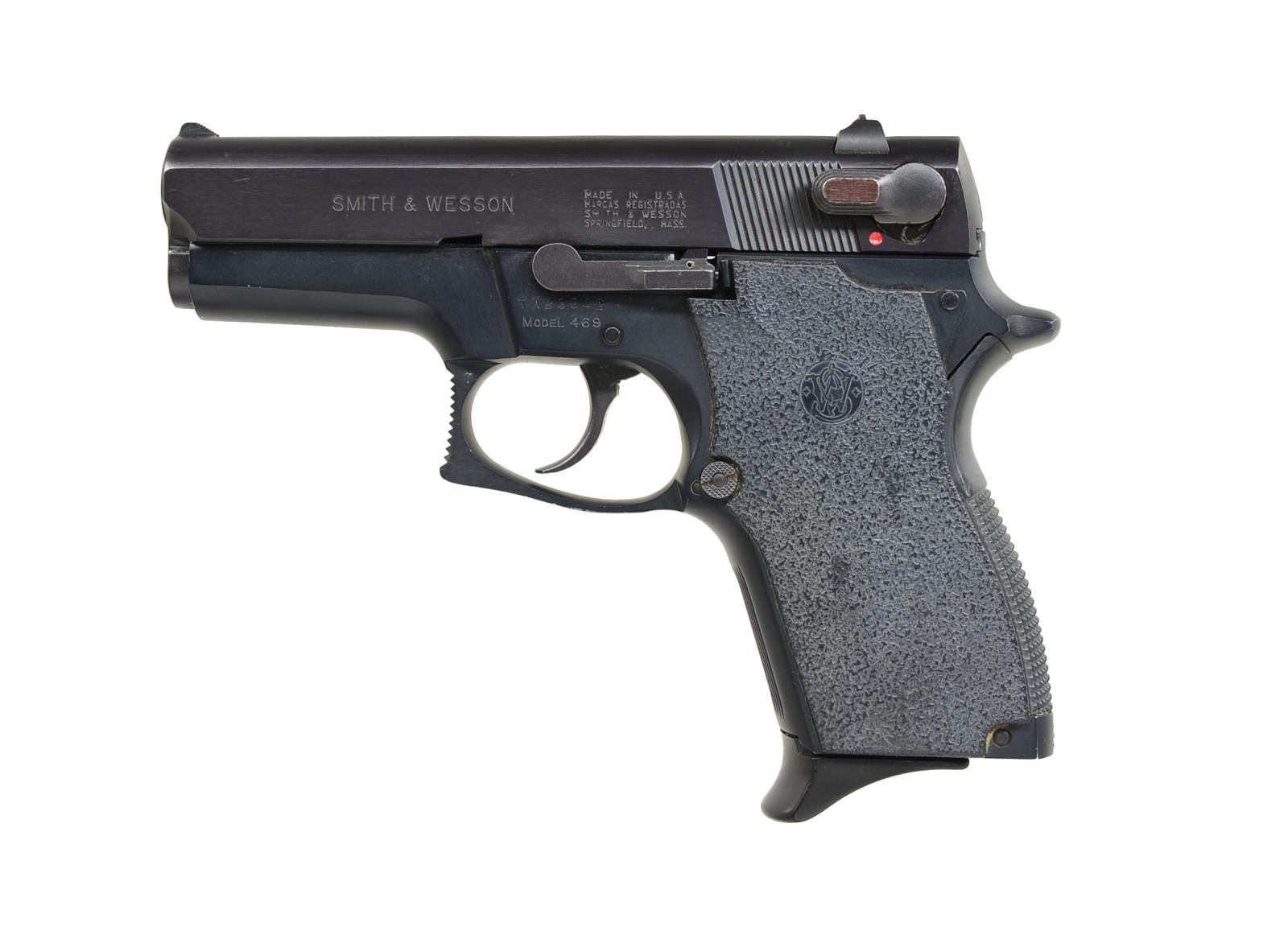 1) SMITH & WESSON MODEL 469. S# TAB3642. Bbl. 3 1/2". Mfg. 1983-1988 w/ matte alloy frame & blued slide having ambidextrous safety. Fixed bar front sight & dovetailed white outlined rear. Grooved front strap plus checkered backstrap & hooked trigger guard. DA functioning w/ bobbed hammer. Thin pebble grain black plastic grips w/ S&W logos. MAGS: 1 factory 12 rd. w/ finger extension. CONDITION: all aspects near excellent including bore & grips. (21-1742/NW).