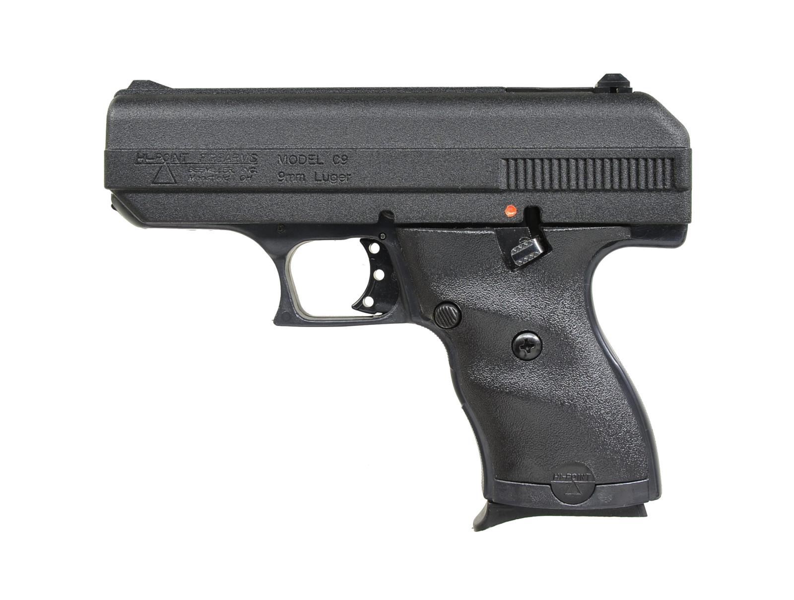 2) HI POINT MODEL C9. S# P1839747. Bbl. 3 1/2". Mfg. after 1994 w/ polymer frame having finger grooved pebble grained logo grips. Recent updates to include: mag. safety, hooked trigger guard & bar dot sight set w/ adj. rear. Matte black powder coated slide plus thumb safety. MAGS: 1 Factory 8 rd. CONDITION: all aspects near excellent w/ unfired appearance. (21-1783/NW). BOTH MODERN. $450-600.
