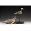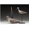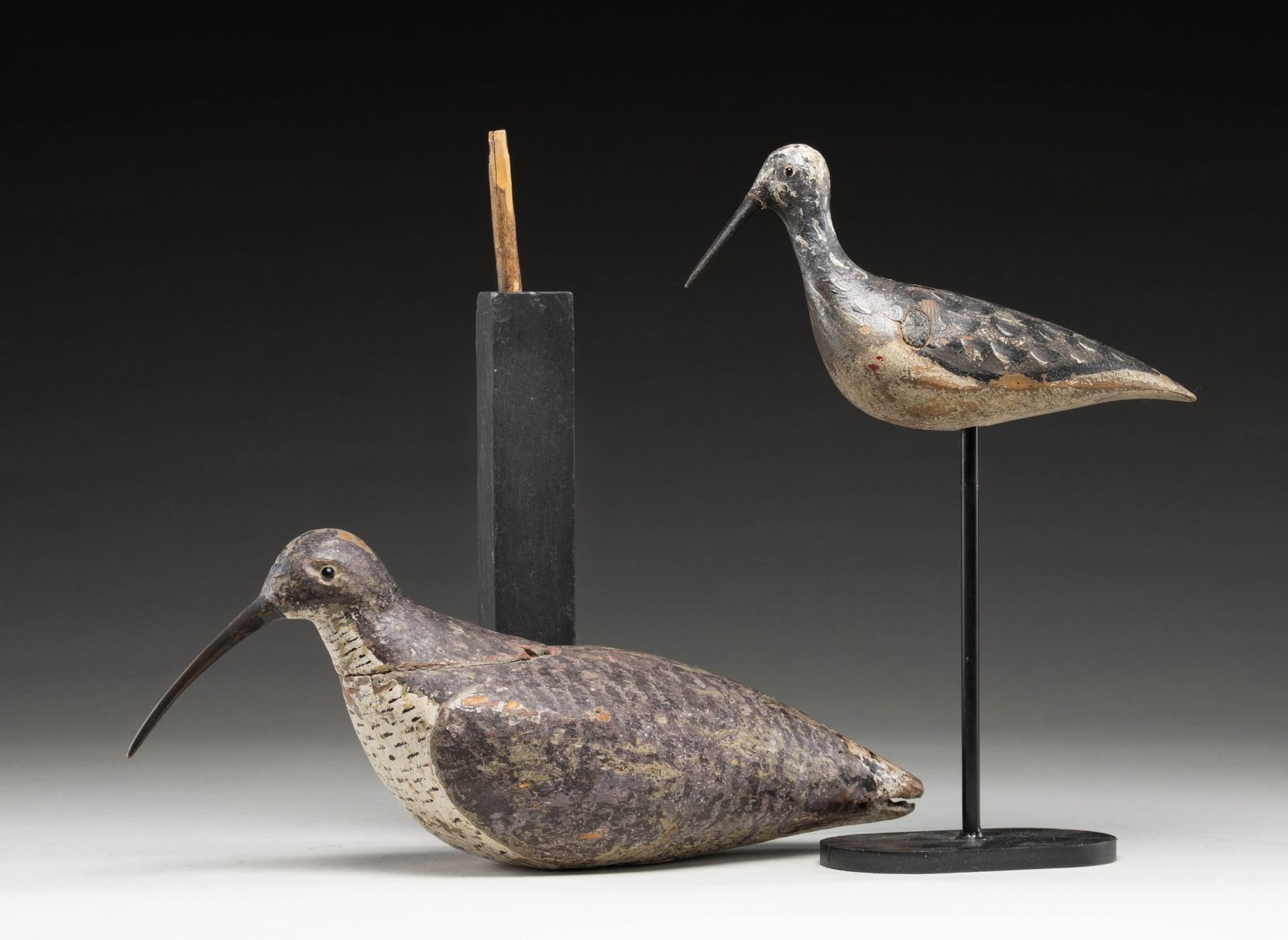 1) Curlew measures 15" with glass eyes and nicely carved in wings. CONDITION: good; remnants of good old over paint considerably chipped through to wood. Very attractive. With stick and metal stand (stand needs to be weighted). 2) Sandpiper measures 9" with glass eyes on black metal stand. CONDITION: good; old paint with many chips. PROVENANCE: From the Private Collection of Berrien Moore III. (02-25874/MGM). $300-600.