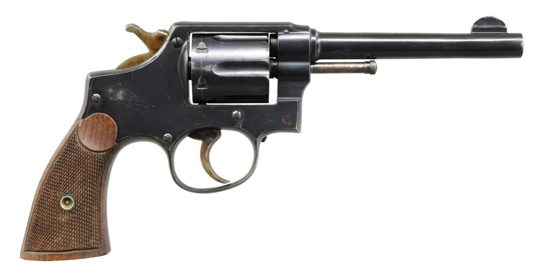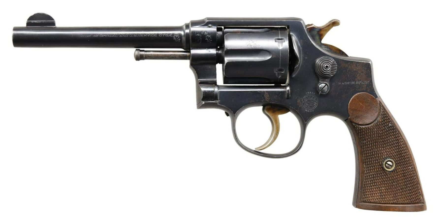 1) T.A.C. MODEL 333. Cal. 38 Spl. S# 250111. Bbl. 5". Round blade front sight. Fixed rear sight. Spanish made S&W style revolver by Trocaola, Aranzabal Y Cia (T.A.C.) w/ unique cyl. release. T.A.C. would cease to exist during the Spanish Civil War. Blue finish. Case colored trigger & hammer. Checkered hardwood grips. CONDITION: grips show scattered dings, light scratches & handling wear. Metal retains 70% blue w/ scattered oxidation & fading to brown. Good bore w/ strong rifling & a couple spots of pitting. (23-4690/MJC). 2) MANUEL ESCODIN MODEL 31. Cal. 38 Spl. S# M344461. Bbl. 4 1/4". Round blade front sight. Fixed rear sight. Spanish made S&W style revolver. Blue finish. Checkered hardwood grips. CONDITION: grips have added varnish w/ overall worn checkering, scattered flaking, a couple chips & dings. Metal retains 30% blue w/ overall flaking to brown, some scratches & oxidation. Good bore w/ strong rifling. (23-4705/MJC). CURIO. $350-550.
