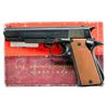 BOTH: cal. 9mm P. Bbls. 5". Ramp front sights w/ square notch rear sights. Checkered plastic grips. Both trigger guards stamped "72" indicating 1972 mfg. 1) S# 1236688. Right side of slide & frame have number "51042" MAGS: 2 detachable 8 rd. UNATTACHED ACCESSORIES: 1 piece box w/ mismatched label containing instruction manual, cleaning rod, & spare mag. CONDITION: over 90% brightly polished reblued finish showing lg. areas of spotted finish loss or fading. Right hand slide lock & extractor have plum color from reblue. Grips show substantial checkering wear & handling marks. Bore is bright w/ strong rifling. (21-785/DS). 2) S# 1236390. Right side of slide & frame have number "50744". MAGS: 2 detachable 8 rd. UNATTACHED ACCESSORIES: 1 piece box w/ proper model label having incorrect S#. Box contains instruction manual & spare mag. CONDITION: 70% dull blue showing edge & carry wear. Grips show moderate checkering wear. Bore is bright w/ strong rifling. (21-786/DS). ALL MODERN. $600-900.