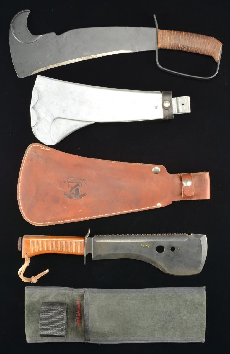 2) WOODSMAN'S PAL - 11 1/2" single edge blade with integral brush hook at top forward end. Blade is marked on right side with "Woodsman's Pal"; then logo numbered "284 PRO TOOL INDUSTRIES INC., BOYERTOWN, PA.". Leather washer handle with "D" guard. Matching brown leather scabbard with "Woodsman's Pal" logo. Scabbard has galvanized sheet metal liner. CONDITION: tool has most of its original finish with light wear and handling marks. Leather scabbard has light wear and staining with tight stitching and appears serviceable. (02-16807-13/RW). $100-200.