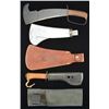 1) SPETSNAZ MACHETE - designed for elite Soviet Commando group and extremely versatile format. 9 3/4" blade; sharpened at bottom and forward end. Back has saw teeth. Left side of blade has white enhanced markings: 0-50 centimeters and 0-90 degrees. Right side of blade marked with A367 serial number. Brown composite handle with transverse ribs. Grips have compartment for survival kit. Pommel is screw in plug. Black nylon and Velcro scabbard marked in red letters, Sovietski Collection. CONDITON: tool appears to be in good serviceable condition with small area of pitting on right side.