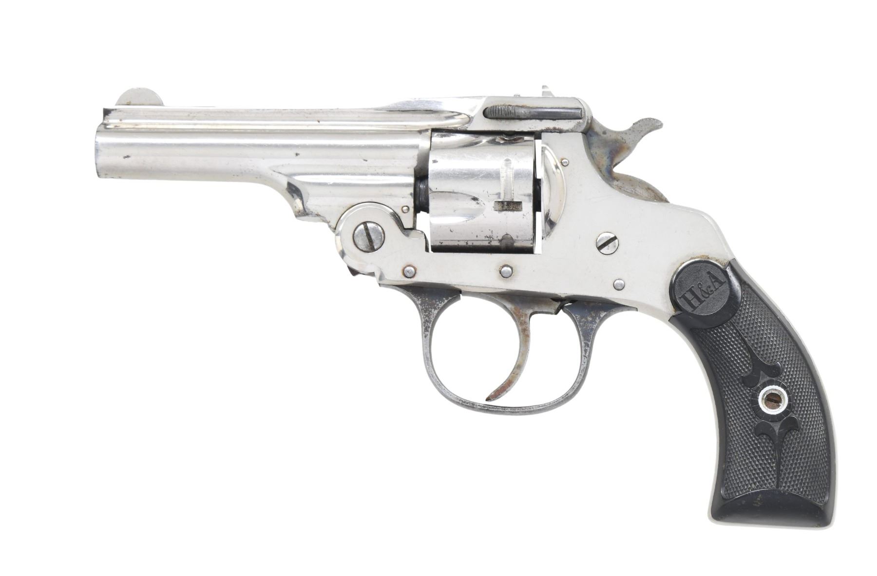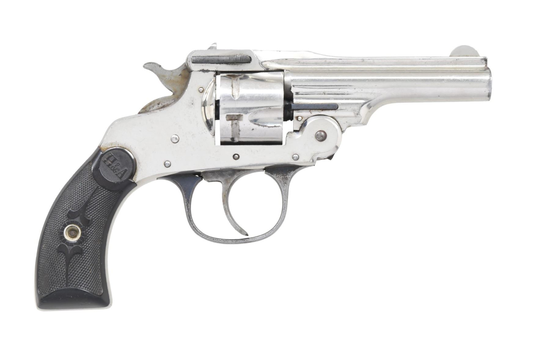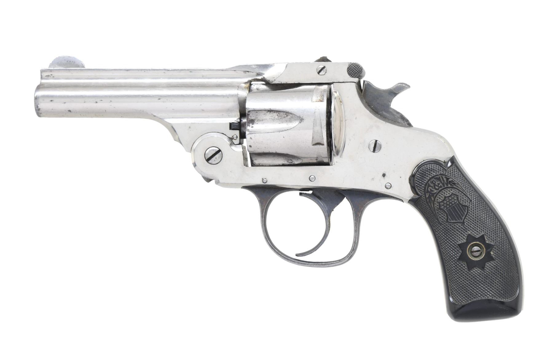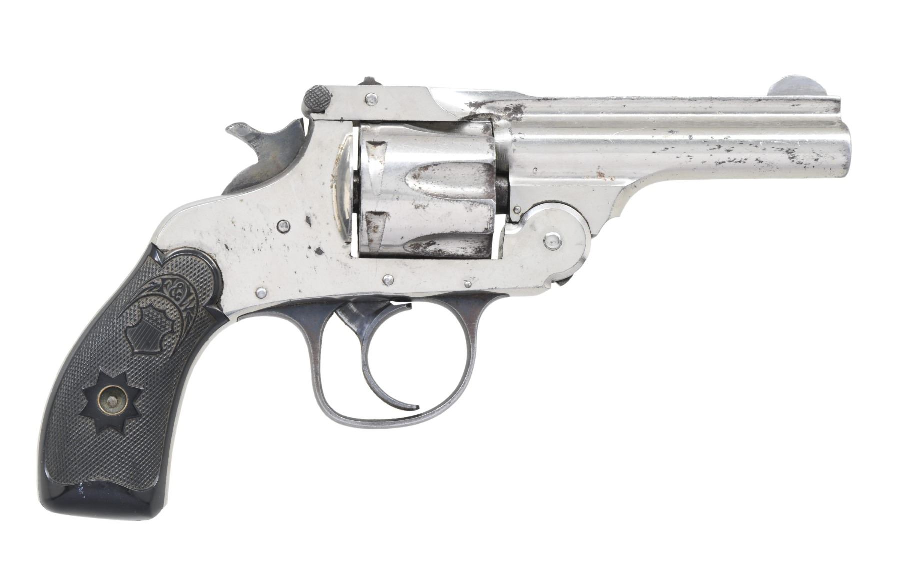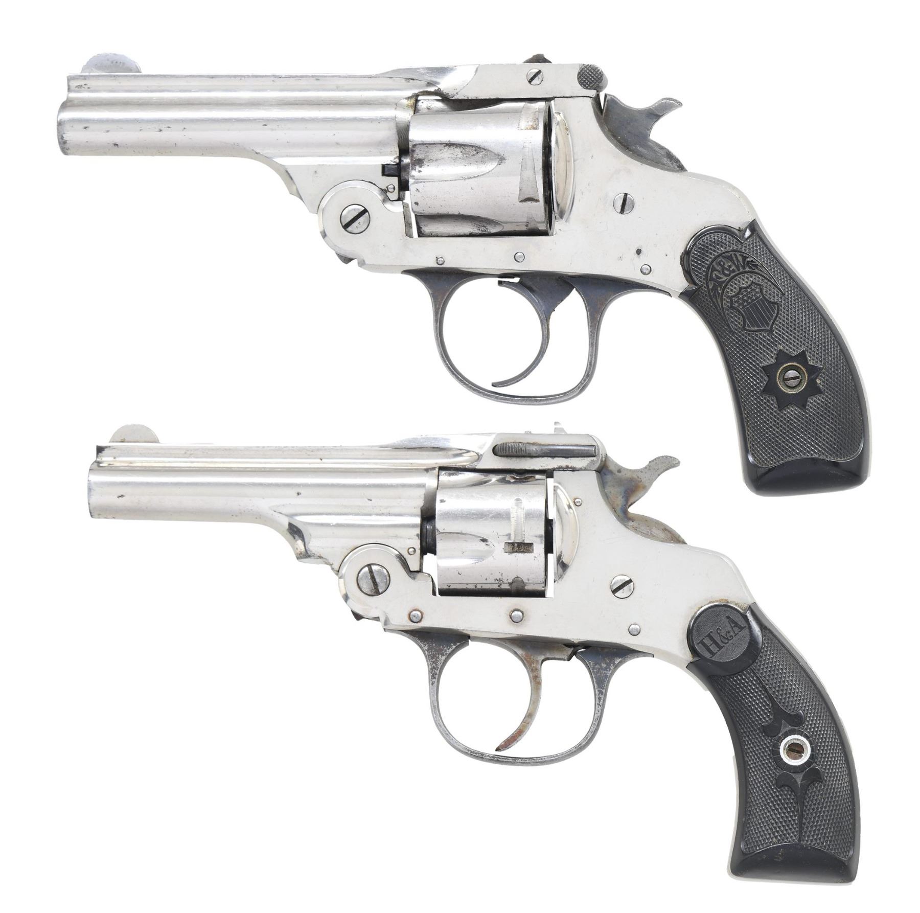 ALL: cal. 32 S&W. Nickel finish. 1) HOPKINS & ALLEN SAFETY POLICE. S# 3310. Barrel 3". Matching numbered 5 shot fluted cyl. & extractor. Two piece hard rubber grips. CONDITION: Good nickel. Triggerguard has traces of blue with mostly gray patina. Good grips. Strong rifling with areas of pitting. (24-7187/MD). 2) FOREHAND ARMS CO. S# 280410. Barrel 3.25". Matching numbered 6 Shot fluted cyl. & extractor. Rebounding hammer in frame. Two piece hard rubber grips. CONDITION: good nickel. Fair triggerguard blue. Good grips. Fair bore with pitting. (24-7244/MD). ALL CURIO. $200-400.
