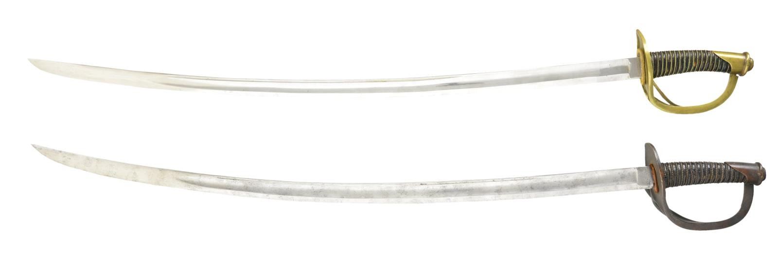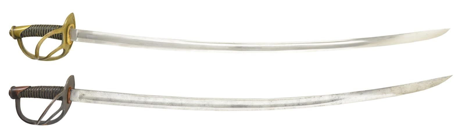 2) Overall length 43 1/2". Blade length 35 1/2". Plain blade with a single wide fuller stamped at the ricasso “SHEBLE & FISHER PHILADA”. Solid brass hilt. Wire wrapped leather grip. Iron scabbard. CONDITION: blade has a light gray patina with minor staining. Hilt is a tiny bit loose and shows a wonderful deep chocolatey patina. Grip shows light wear and complete wire. Scabbard has a dark patina. (02-18983/BF). $800-1,200.