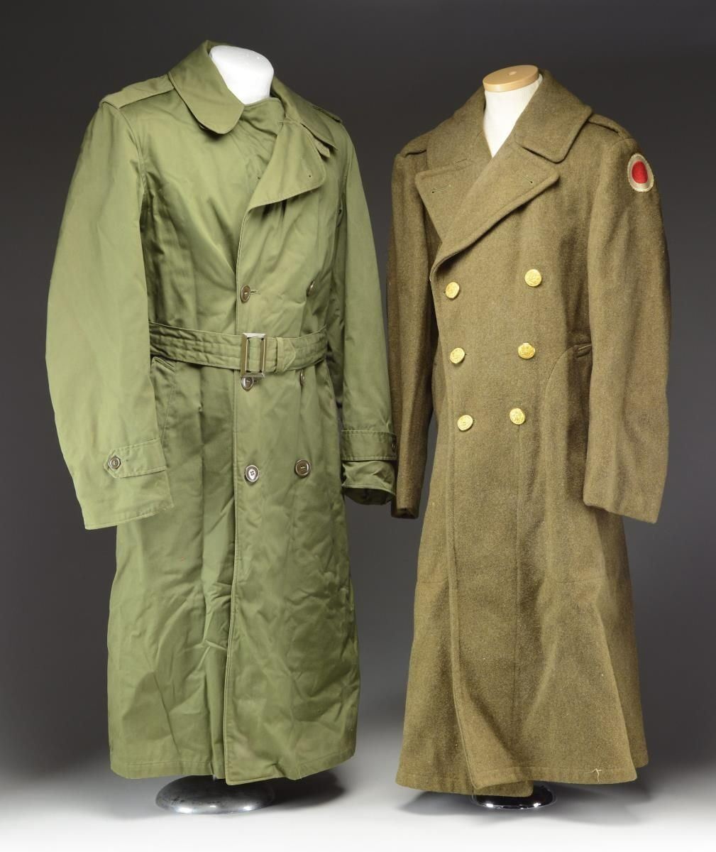 This lot includes a large, heavy OD wool overcoat with a 37th Infantry Brigade Patch at the left shoulder. / 1 Heavy insulated OD overcoat with large plain plastic dark green buttons. CONDITION: overcoats show light wear overall. (02-20927/BF). $100-200.