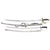 1) CAVALRY. Overall length: 42 1/2". Blade length: 34 3/4". Plain blade has a single wide fuller with a secondary fuller near the spine. The ricasso is stamped “US G.K.C 1864” and “Made by AMES MF’G CO CHICOPEE MASS.” Brass 2-branch, semi-basket guard. Wire-wrapped leather grip. Iron scabbard with Stuart hanger attached. Hanger is marked “R.I.A.” on the reverse. CONDITION: blade has a light gray patina. Hilt has a pleasing mustard patina. Grip is undamaged. Scabbard shows light wear with a somewhat mottled finish. Hanger is complete. 2) OFFICERS. Overall length: 36 1/2". Blade length: 29 1/2". An M1902 saber for all officers with a blade that is etched with foliate and patriotic motifs. Plated hilt with 3-branch guard. Black plastic grip. Plated scabbard. Saber comes with a felt storage bag. CONDITION: saber shows very light wear. (02-22714-1/BF). $500-700.