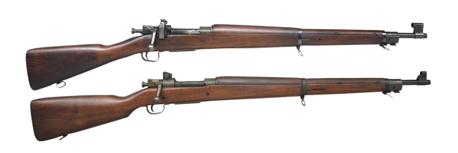1) SMITH CORONA 03-A3. Cal. 30-06. S#4802837. Bbl. 24", marked behind front sight “SC” “flaming bomb” “10-43”. Rear sight has been replaced by Lyman 48 aperture rear sight w/ target knobs. Slide is graduated to 60 points. Original front sight replaced w/ Lyman target front sight w/ interchangeable inserts. Aperture insert is present in sight. Bolt has correct scalloped sleeve. Bolt marked “R”. All stamped furniture including correct lg. bow trigger guard & checkered trap buttplate. Walnut stock set. Buttstock marked on left side w/ boxed “FJA”. (Crossed cannons), marked under grip w/ encircled “P” & “K”. Assembly numbers stamped ahead of trigger guard. CONDITION: stock has lg. percentage of original finish w/ moderate wear, staining & handling marks. Metal has 75% original blue & parkerized finish w/ light wear & scattered scratches. Markings have been enhanced in white. Near excellent, shiny bore. (21-428/RW). MODERN. 2) REMINGTON 1903 A-3. Cal. 30-06. S#3526900. Bbl. 24”, marked behind front sight w/ “RA” “(flaming bomb)” “3-43”. Adj. aperture rear sight. Blade front sight w/ protective hood. Hood marked w/ “U.S.” & “(flaming bomb)”. All visible parts markings are “R” except sm. bow trigger guard is “Smith Corona”. All stamped furniture except smooth, milled buttplate. Replacement walnut stock set w/ scant grip buttstock. Marked on left side w/ boxed “OG”& under pistol grip w/ “P”. CONDITION: stock set has nice original finish w/ light wear & handling marks & notable scattered fine scratches on buttstock. Metal has 90% arsenal rework type parkerization. Fair, worn bore turning dark in grooves. (21-445/RW). CURIO. $900-1,400.