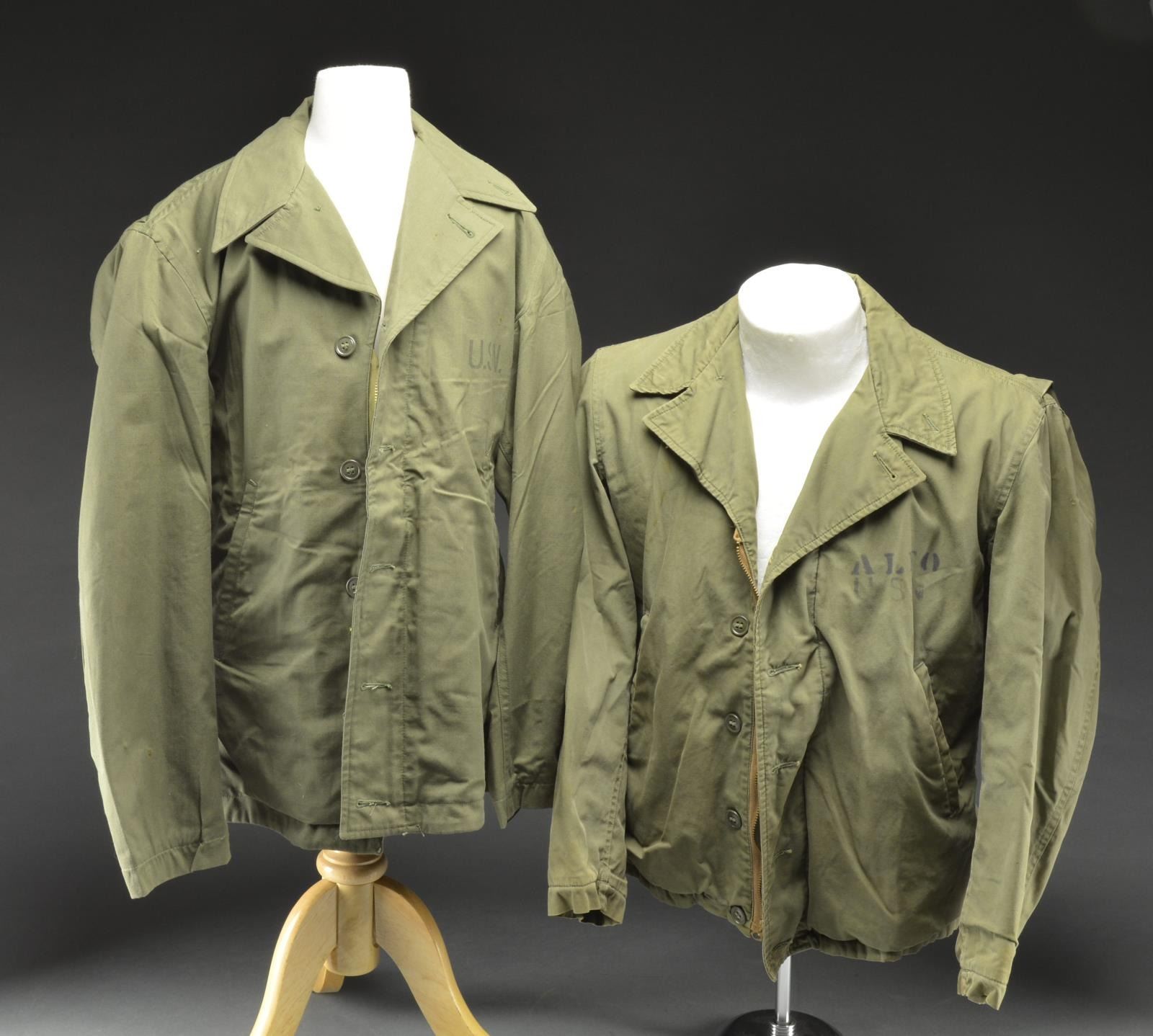 2) M41 OD green jacket marked on left front "U.S.N." 2 Slash pockets. Zipper & button closure. White tag on inside back "Cont. NXsx 83844 Size 34". CONDITION: jacket in very good serviceable condition & may be unissued. (02-15902/RW) $600-800.