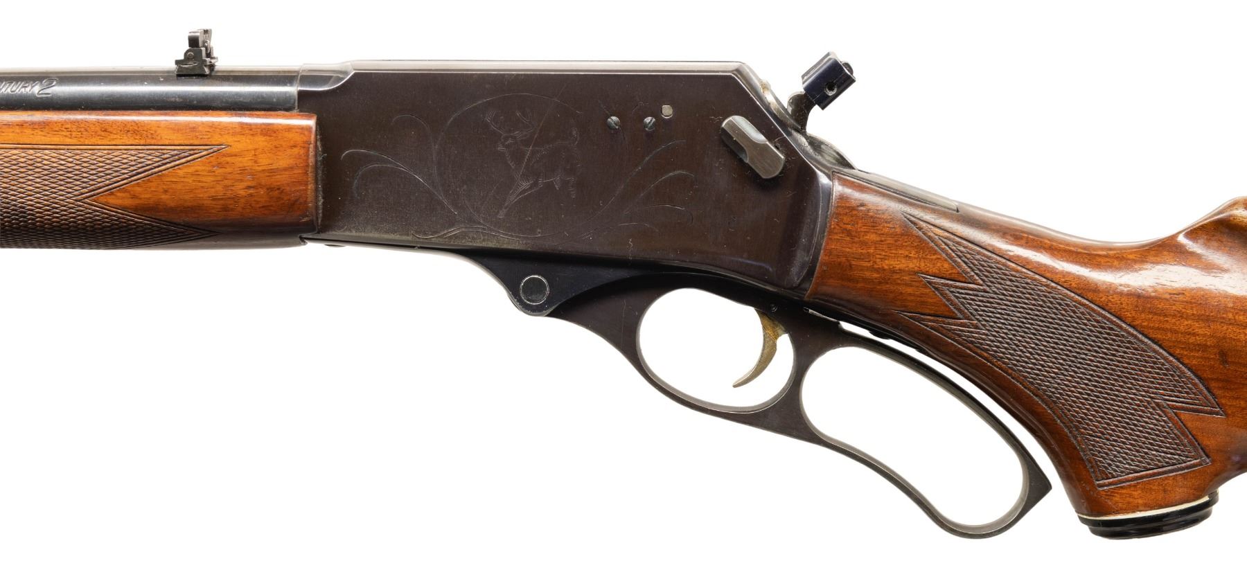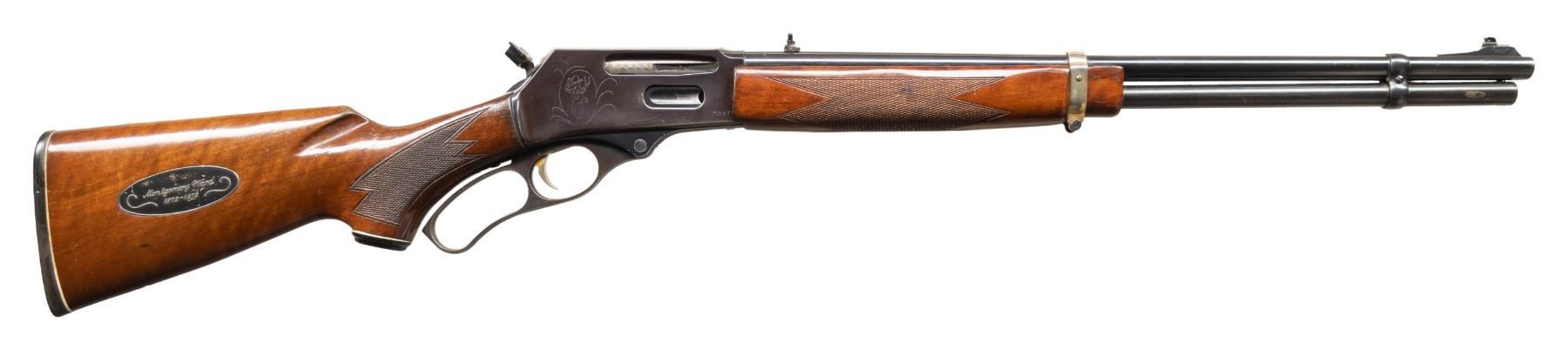 2) CENTURY 2. S# 0697. Mfg. 1972 for Montgomery Ward's 100th anniversary with plaque on right side buttstock & light engraving on receiver. Hammer has extension. Checkered wood has missing toeline swivel. CONDITION: good blue with receiver acquiring a plum tone. Good wood finish with handling marks. Very good rifling. PROVENANCE: From the PMRB Collection. (25-5827/MD). CURIO. $600-800.