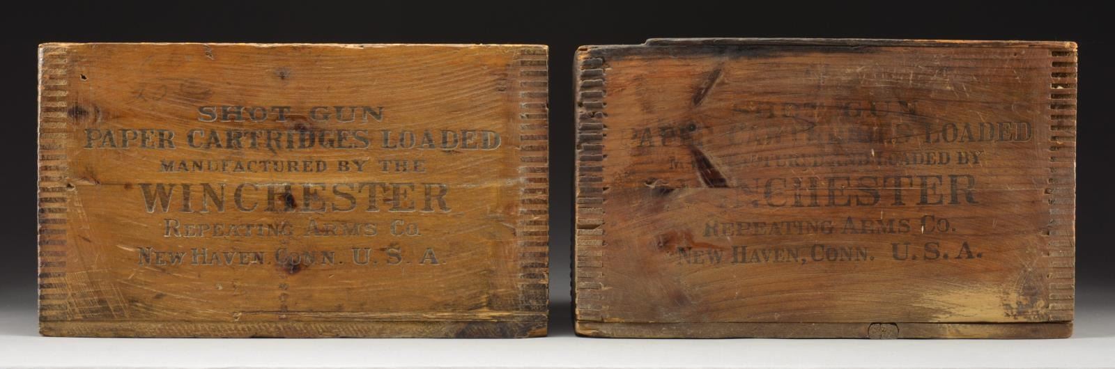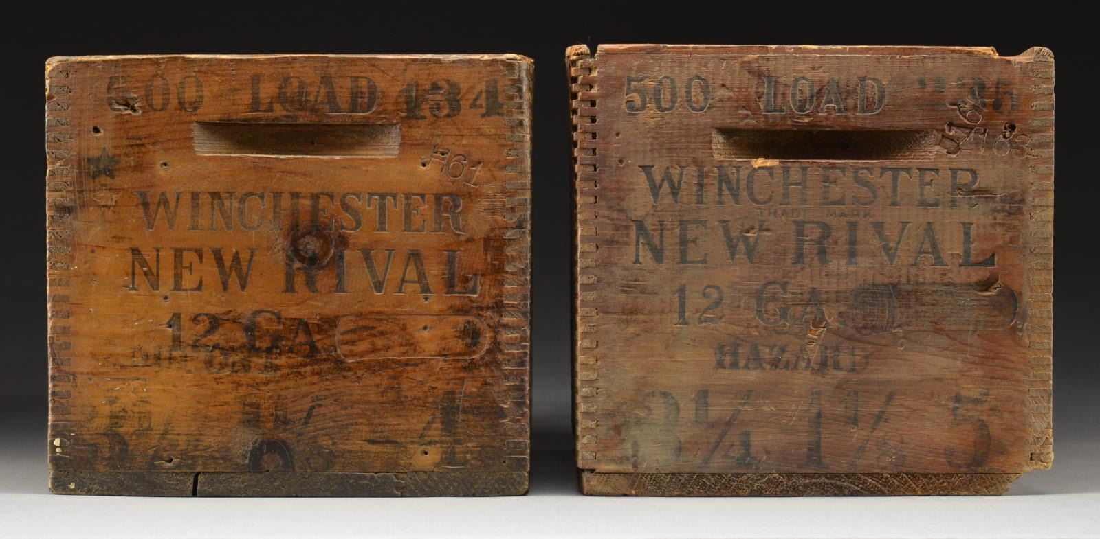 Approx. 15" x 9.5" x 9" boxes for 500 shells of 12 G., 3 1/4", 1/18 oz., #5. Dovetail pieces sides w/ nailed floor board. CONDITION: "Hazard" marked box w/ moderate handling marks & worn appearance. Sm. pieces of wood missing from top, 1 hole on side & 1" x 10" piece missing from bottom. Other box has shell inlay missing from end, wear, fading & lg. grain cracks. (02-16599-10/MD). $300-500.
