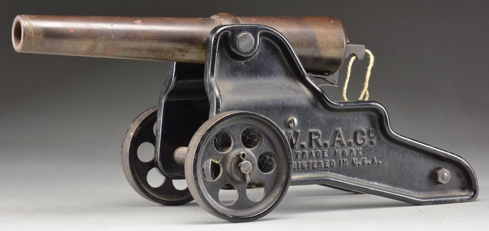 Cal. 10 Ga. Blanks. Bbls. 12" w/ 1 1/4" diameter at muzzle. Black painted iron carriage & wheels. Mfg. 1908-1958.