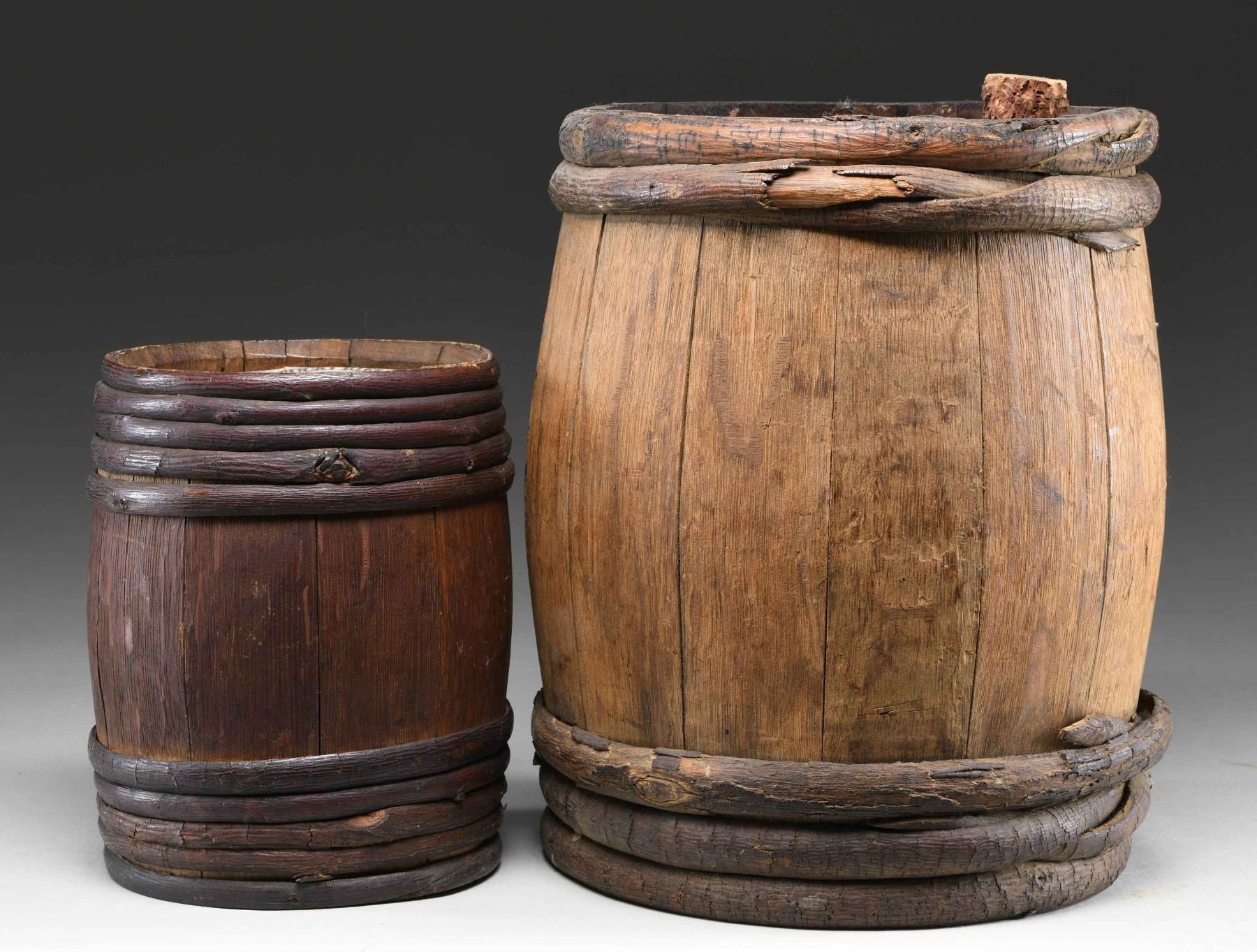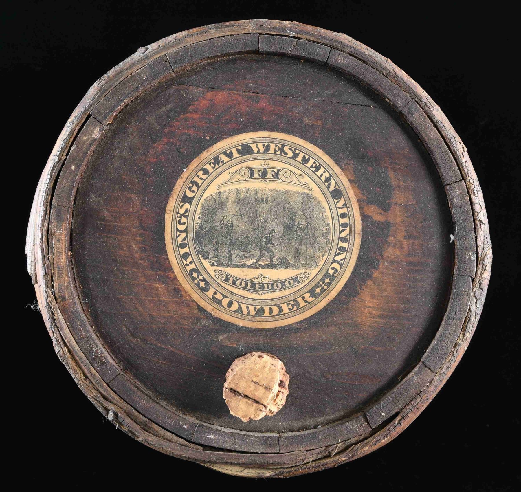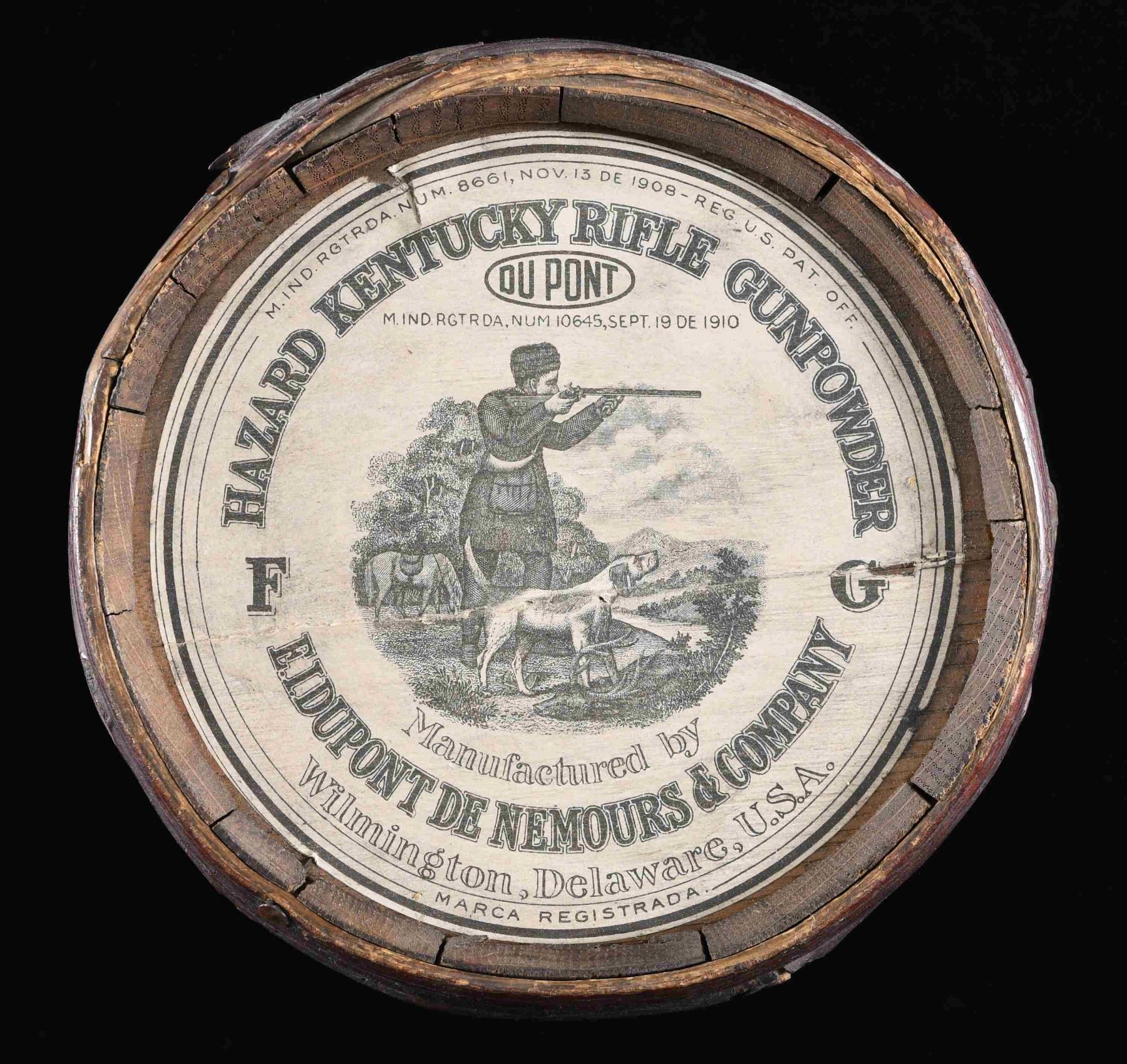 1) King's Great Western Mining powder keg. Keg measures approx. 12.5" height with 10" diameter at lids. Top lid has paper label & cork cap. Keg has wooden wrappings around top & bottom. 2) Wooden keg. measures approx. 9" height & 6.5" diameter at lids. Top has paper label reading " HAZARD KENTUCKY RIFLE GUNPOWDER / E. I. Dupont De Nemours & Company" Top & bottom of barrel has wooden wrappings. Base has screw wooden cap. CONDITION: both kegs appear in good intact condition showing wear & residue. Dupont keg shows large crack though top lead & label. PROVENANCE: from the renowned collection of quality sporting arms from Lewis Drake together with inventory of Lewis Drake Associates. (02-23576/MD). $500-1,000.