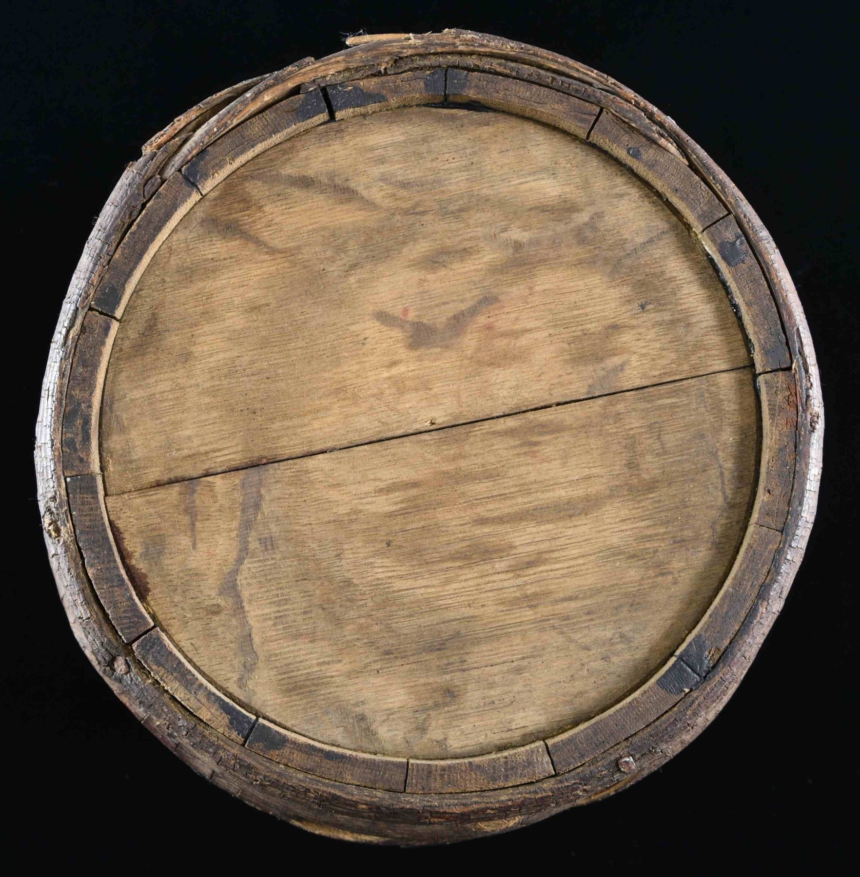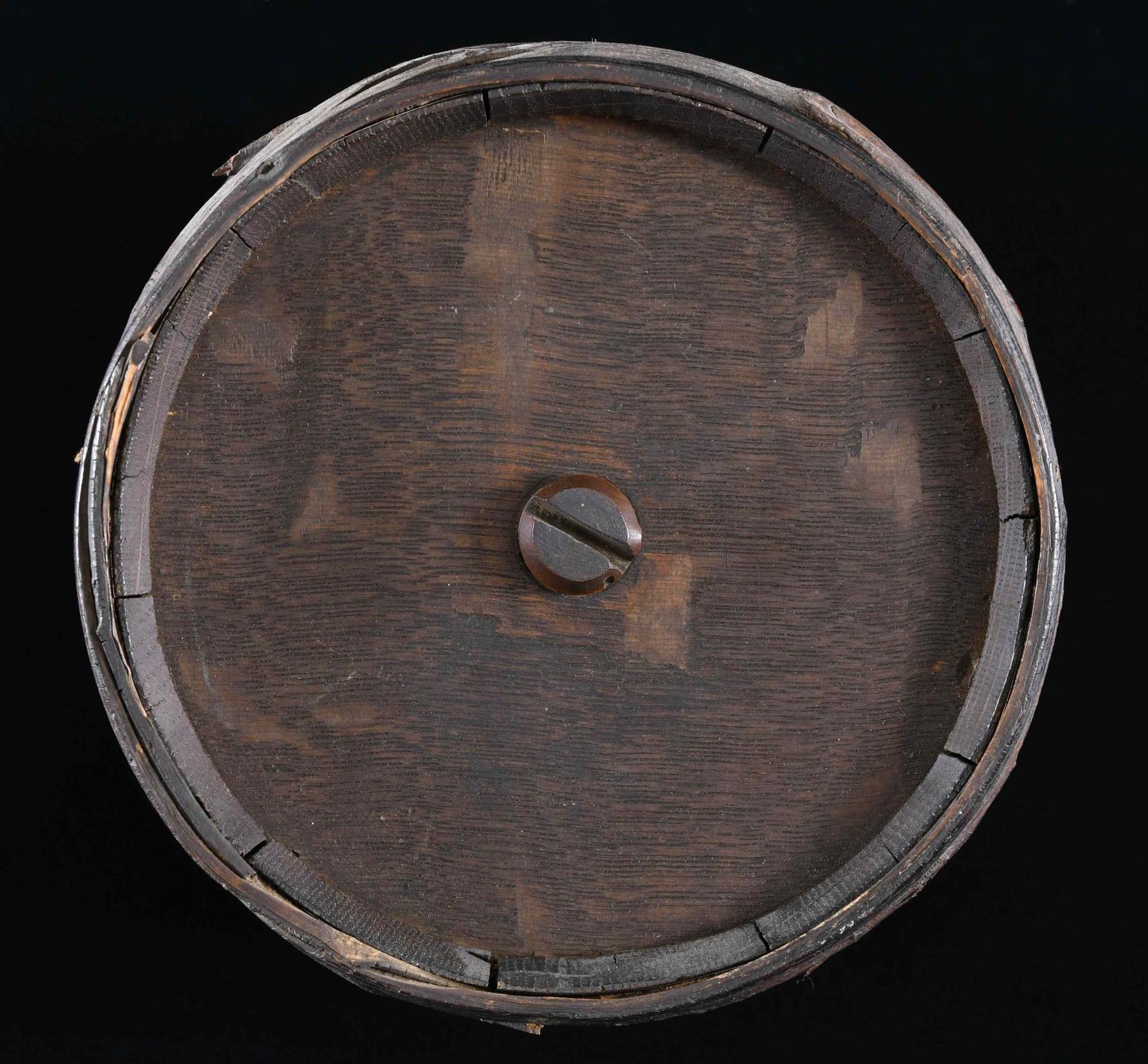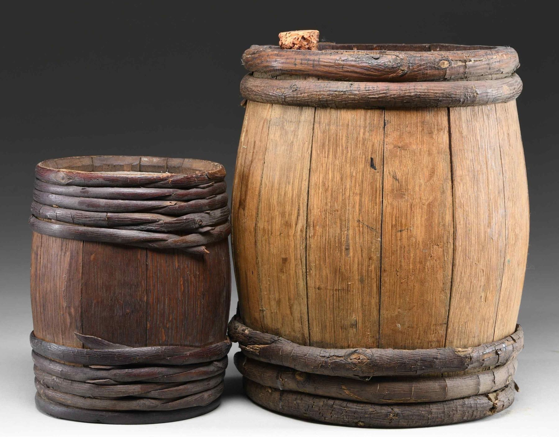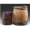 1) King's Great Western Mining powder keg. Keg measures approx. 12.5" height with 10" diameter at lids. Top lid has paper label & cork cap. Keg has wooden wrappings around top & bottom. 2) Wooden keg. measures approx. 9" height & 6.5" diameter at lids. Top has paper label reading " HAZARD KENTUCKY RIFLE GUNPOWDER / E. I. Dupont De Nemours & Company" Top & bottom of barrel has wooden wrappings. Base has screw wooden cap. CONDITION: both kegs appear in good intact condition showing wear & residue. Dupont keg shows large crack though top lead & label. PROVENANCE: from the renowned collection of quality sporting arms from Lewis Drake together with inventory of Lewis Drake Associates. (02-23576/MD). $500-1,000.