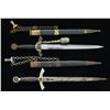 1) Overall length: 19 1/8”. Blade is marked near the hilt “(logo) GEBR. HELLER MARIENTHAL b. SCHWEINA/THR.”. Plated crossguard & pommel w/ mobile party symbols. Wire-wrapped blue leather grip w/ correctly tied knot. Blue leather covered scabbard w/ plated mounts. Original hanger. CONDITION: blade shows primarily scabbard wear. Mounts have a dark tarnish & some loss of plating. Grip shows light wear w/ a few minor losses. Knot has heavy wear to one section. Scabbard leather is nearly complete but peeling near the tip. Mounts are tarnished w/ some finish loss. Hanger is complete & functions well. 2) Overall length: 19 1/8”. Blade is marked near the hilt “RICH. A. HERDER SOLINGEN”. Aluminum crossguard & pommel w/ mobile party symbols. The rear crossguard party symbol is missing. Wire-wrapped blue leather grip. Blue leather covered scabbard w/ plated mounts. Original hanger. CONDITION: blade has a gray patina w/ areas of active oxidation & two small nicks to the blade. Mounts show patina. Much of the blue leather has worn off the grip, but the wire is complete. Scabbard mounts have a dark oxidized finish w/ most of the plating gone. Blue leather shows scuffs & scrapes but is 85% complete. Hanger functions well. (02-21220/BF). $700-1,000.