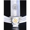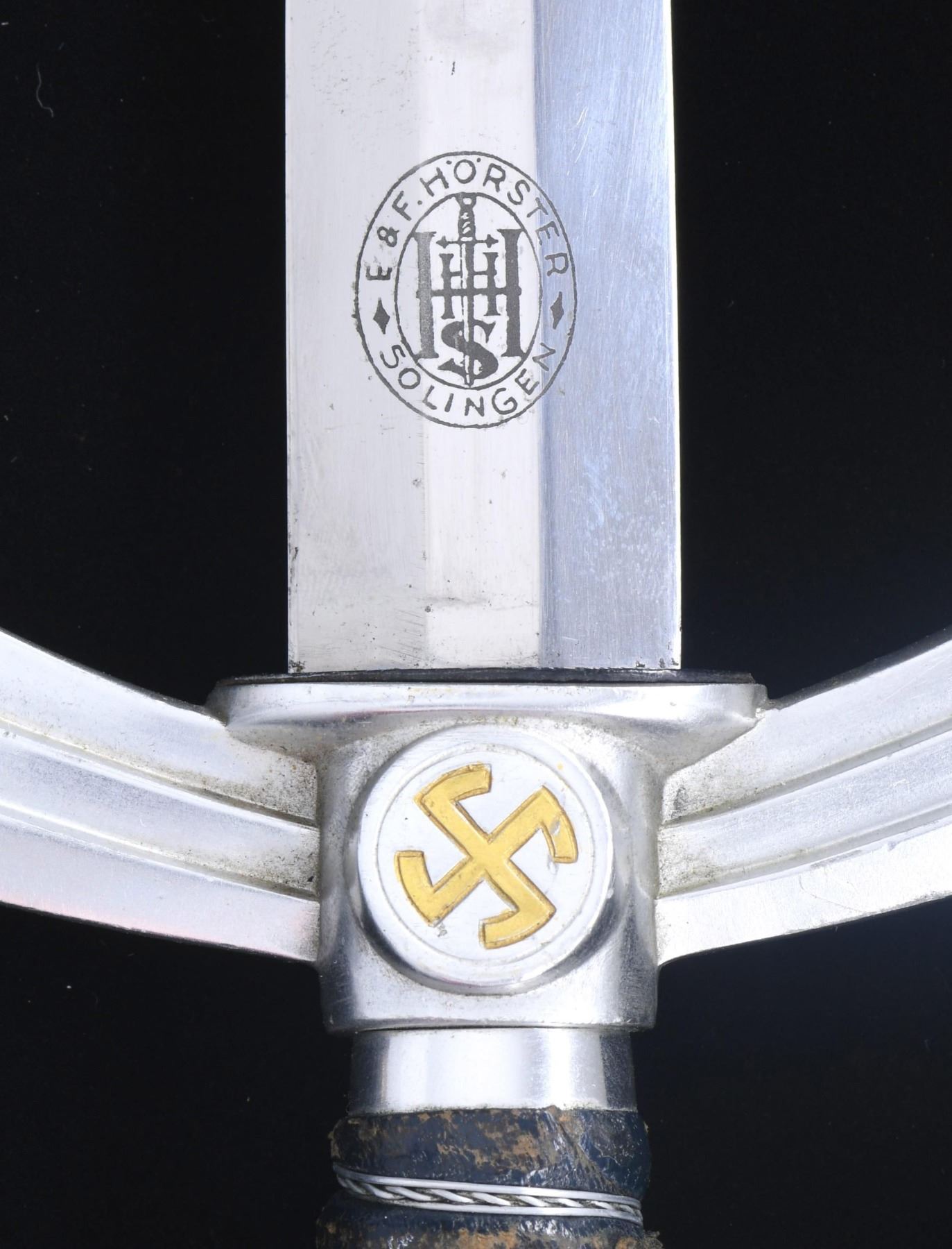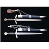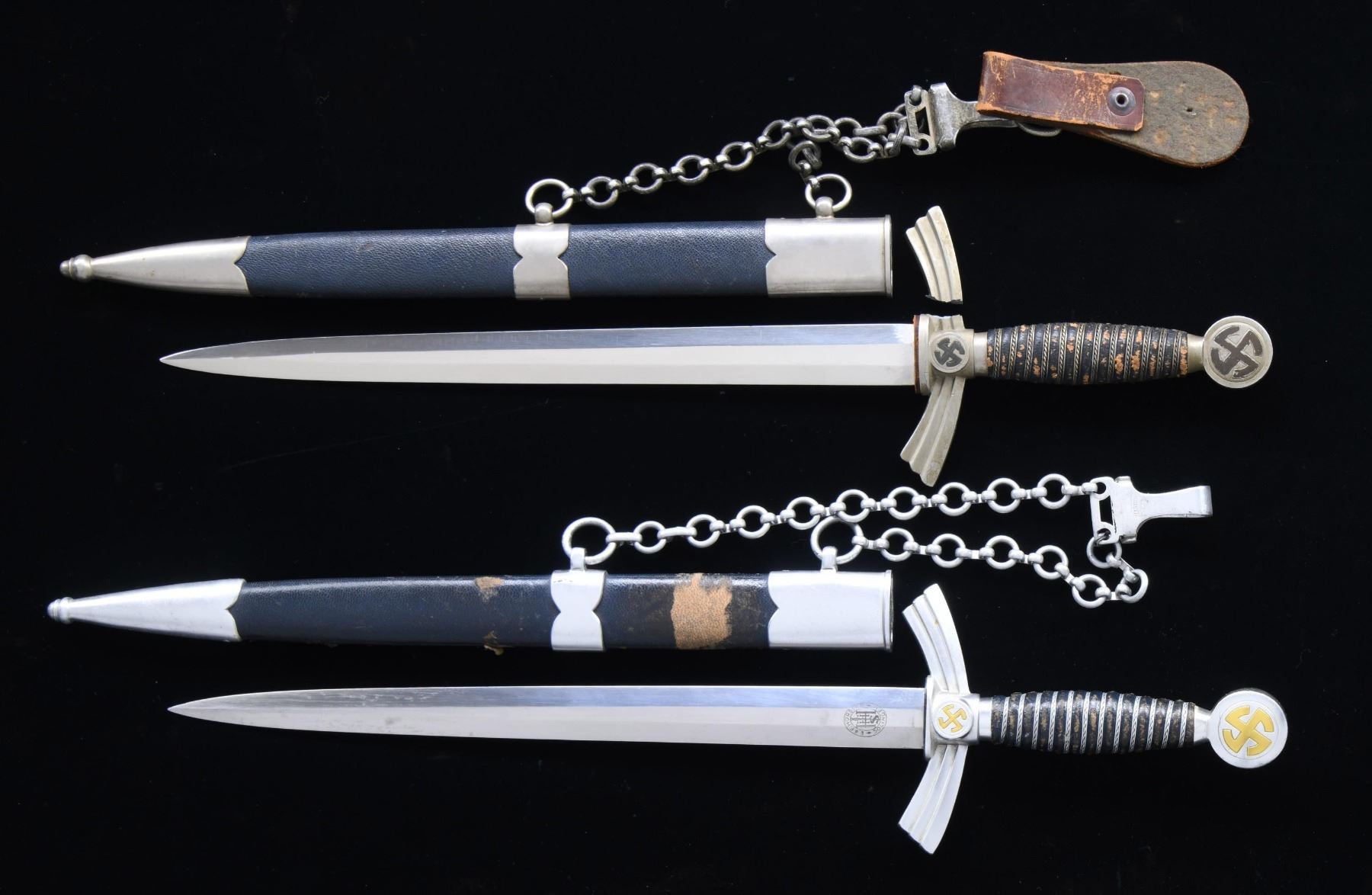 1) Overall length: 19 1/4". Plain blade marked on the reverse "E & F. HORSTER (logo) SOLINGEN." Aluminum crossguard and pommel, both featuring central gilded mobile Party symbols. Wire-wrapped blue leather grip. Aluminum-mounted blue leather scabbard with original hanging chain attached. CONDITION: blade shows original factory polish. Hilt shows light overall wear. Scabbard has a stripe of missing finish where adhesive tape was at one time attached. 2) Overall length: 19". Plain blade with no markings. Plated crossguard and pommel, both featuring a black-painted central mobile Party symbol. Wire-wrapped blue leather grip. Blue leather scabbard with plated mounts and original hanging chain attached. CONDITION: blade shows original factory polish. One side of the crossguard is broken, but the piece is present. Grip shows moderate wear. Scabbard shows light overall wear. (02-23377-4/BF). $750-1,000.