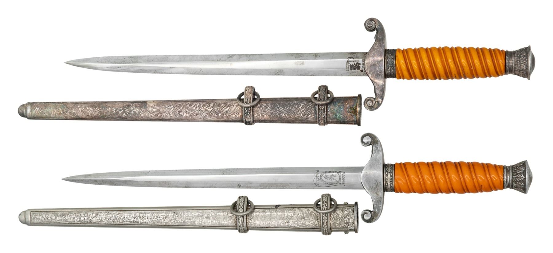 1) A nice example of a WWII German Army dagger measuring 15 3/4" overall with a plain blade marked "Siegfried EARNST PACK & SOHNE M.B.H. WAFFENFABRIK (logo) SOLINGEN WAFFEN". Plated eagle crossguard with plated oak leaf embellished pommel and ferrule. Dark orange grip. Plated scabbard. CONDITION: blade shows some original factory polish. Mounts show light wear as does the scabbard. 2) A nice example of a WWII German Army dagger measuring 15 5/8" overall with a plain blade marked "ORIGINAL (logo) Eickhorn SOLINGEN". Plated eagle crossguard with plated oak leaf embellished pommel and ferrule. Dark orange grip. Plated scabbard. CONDITION: blade shows some original factory polish. Mounts show light wear and fairly heavy tarnish. Scabbard has a similar patina. (02-25784/BF). NON-GUN. $800-1,100.