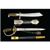 1) RAD ENLISTED HEWER. Overall length: 15 5/8". Single fullered blade is etched, “Arbeit adelt”. The blade marked at the ricasso, “RJAD” in a triangle & “GES. GESCH.” w/ another mfg. mark that is illegible but has a pyramid as a central logo. Plated guard. Eagle beak pommel. 2 Piece antler grips. Black enameled scabbard w/ plated mounts. CONDITION: blade shows notable wear likely from years of field service. Hilt shows light to moderate wear. Grips are undamaged. Scabbard shows moderate overall wear. (02-15070/BF). 2) FORESTRY DAGGER. Overall length: 18 3/4". Blade is etched over nearly its entire length w/ hunting scenes. Ricasso stamped “E.u.HORSTER(logo)SOLINGEN”. Gold washed aluminum hilt. There is a dark green & silver bullion knot attached to the hilt. 2 Piece antler grips w/ 3 acorns/oak leaves on each grip. Gilded aluminum mounted leather scabbard. CONDITION: blade shows slight discoloration. Etching remains crisp. Gold finish on hilt is approx. 60%. Grips are undamaged. Knot shows light to moderate wear. Scabbard shows light to moderate wear. (02-15107/BF). $700-1,000.