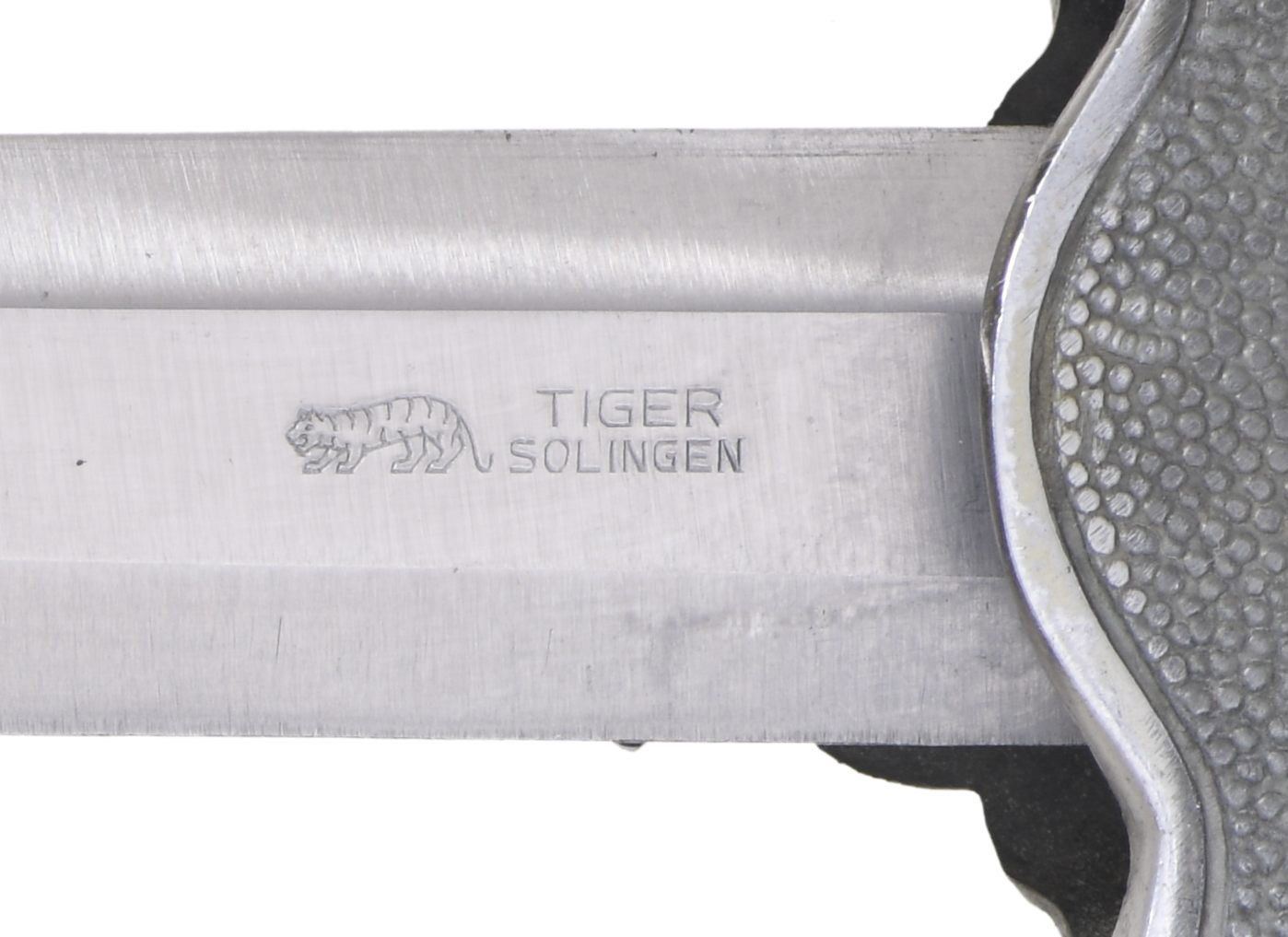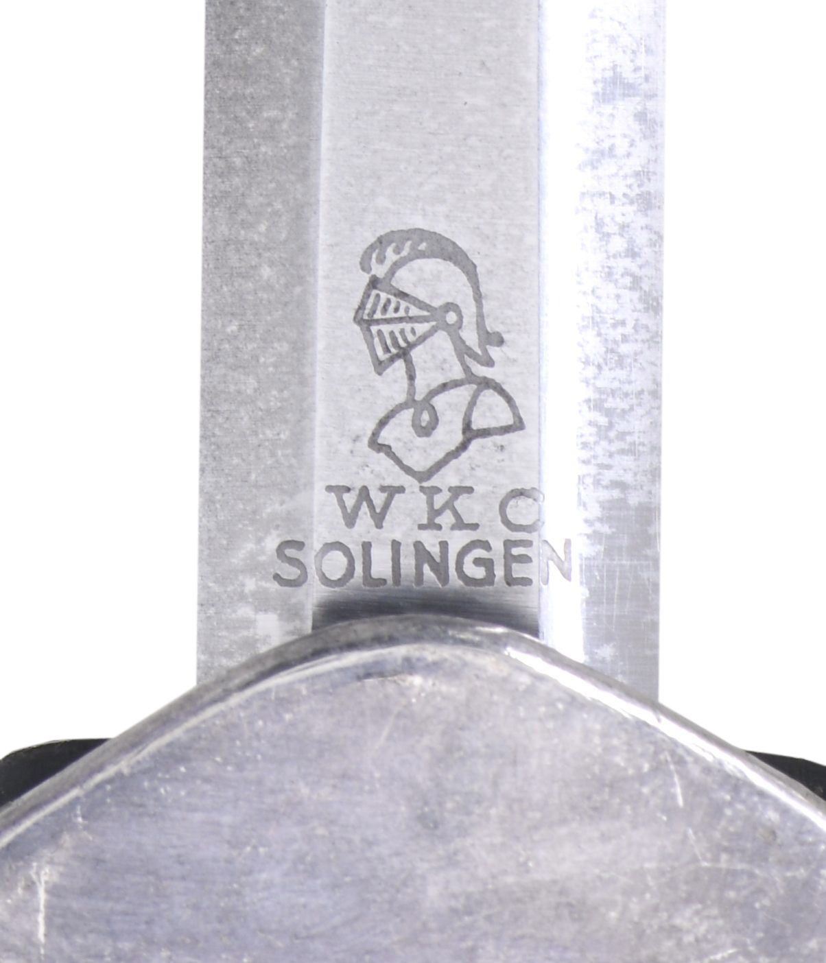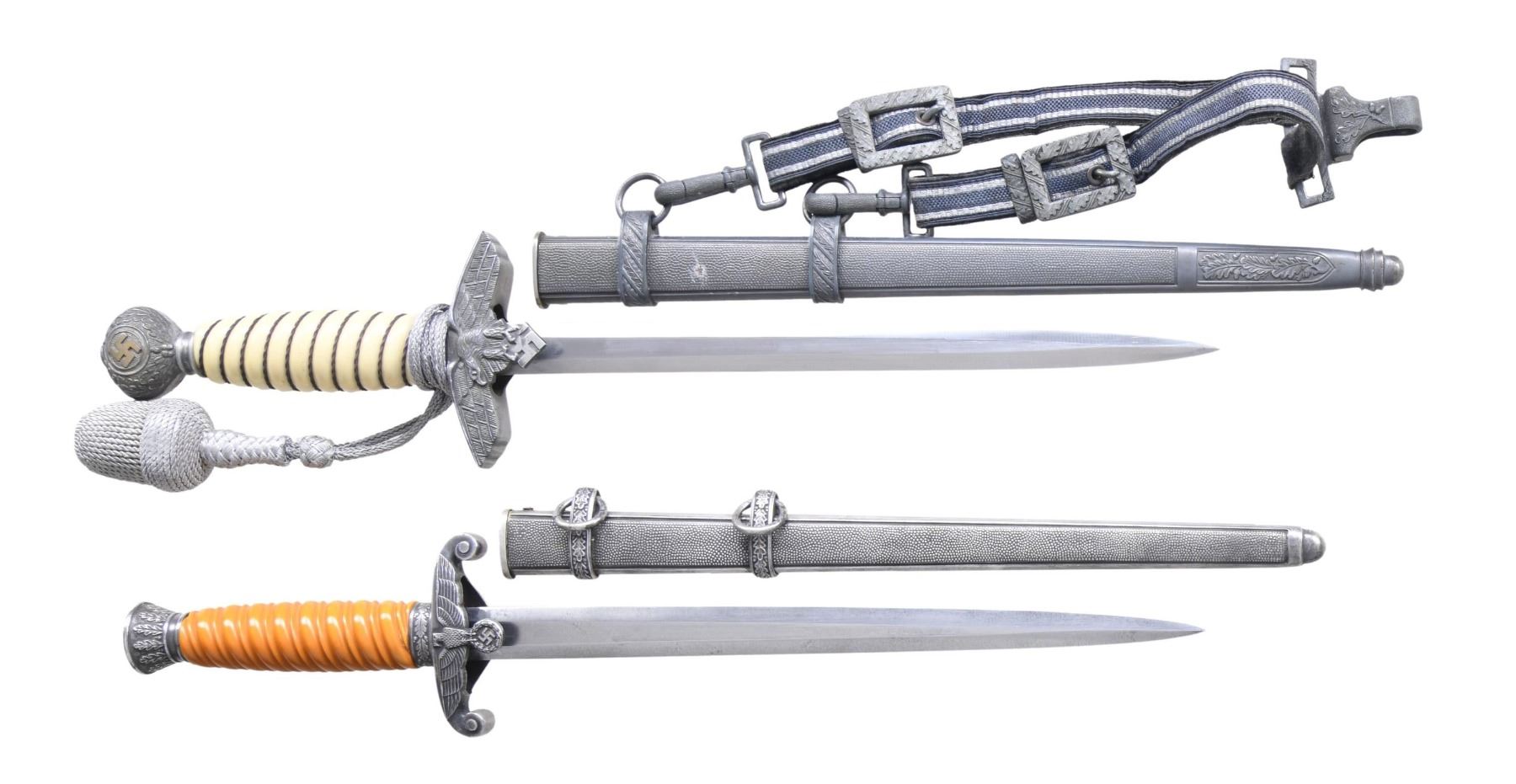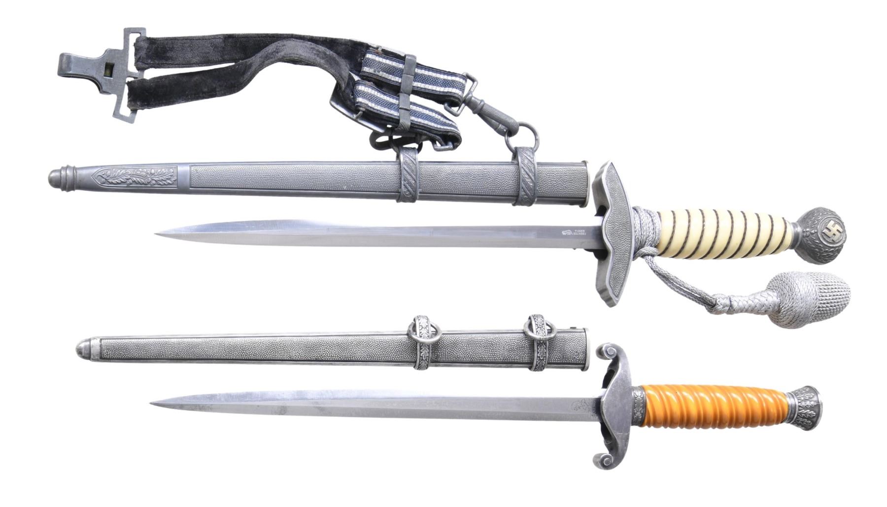 1) WEHRMACHT. This army dagger measures approx. 15 1/2" overall with a plain blade marked on the reverse "(logo) WKC SOLINGEN." Plated eagle crossguard with oak leaf-embellished plated pommel and ferrule. Orange composite grip. Plated scabbard. CONDITION: dagger shows light wear overall, with tarnish to the plated components. 2) LUFTWAFFE. This Luftwaffe dagger measures approx. 17" overall with a plain blade, marked on the reverse "(logo) TIGER SOLINGEN." Aluminum eagle crossguard with an oak leaf-embellished pommel, showing central gilded Party symbols. Oak leaf-decorated ferrule with a wire-wrapped white composite grip. There is a dagger knot attached to the hilt. Plated scabbard with original Luftwaffe hangers attached. CONDITION: dagger shows light wear overall, with tarnish primarily visible on the scabbard. Hanger also shows light wear. (02-23377-2/BF). $750-1,000.