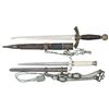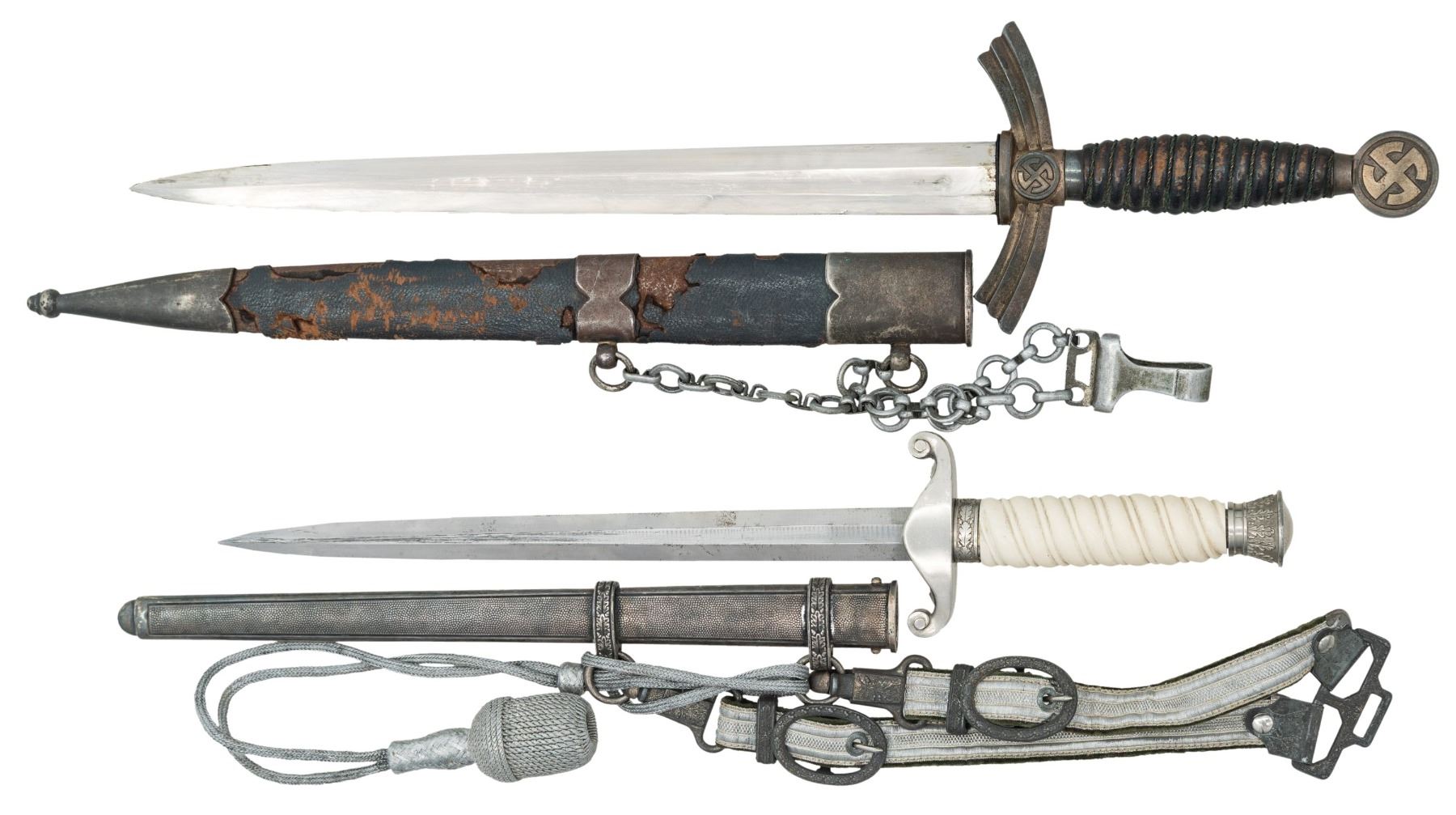 1) A rough example of an original WWII German 1st model Luftwaffe dagger measuring 19 1/4"overall with a plain unmarked blade. Plated crossguard and pommel with gilded mobile Party symbol. Leather grip with wire wrap. Leather covered scabbard with palated mounts and original chain hanger. CONDITION: blade is pretty nice with some factory polish remaining. Hilt is undamaged but heavily tarnished. Grip leather has a worn finish but the wire is complete. Scabbard leather is badly deteriorated with the mounts and hanger showing light wear. 2) A good example of a WWII German Army dagger measuring 15 3/4" overall with a plain unmarked blade. Plated eagle crossguard with plated oak leaf embellished pommel and ferrule. Cream colored grip. Plated scabbard with original hanger and knot attached . CONDITION: blade shows some original factory polish. Mounts have been cleaned. Scabbard has a dark tarnished finish. Hangers and knot show light wear and are complete. (02-25781/BF). NON-GUN. $800-1,200.