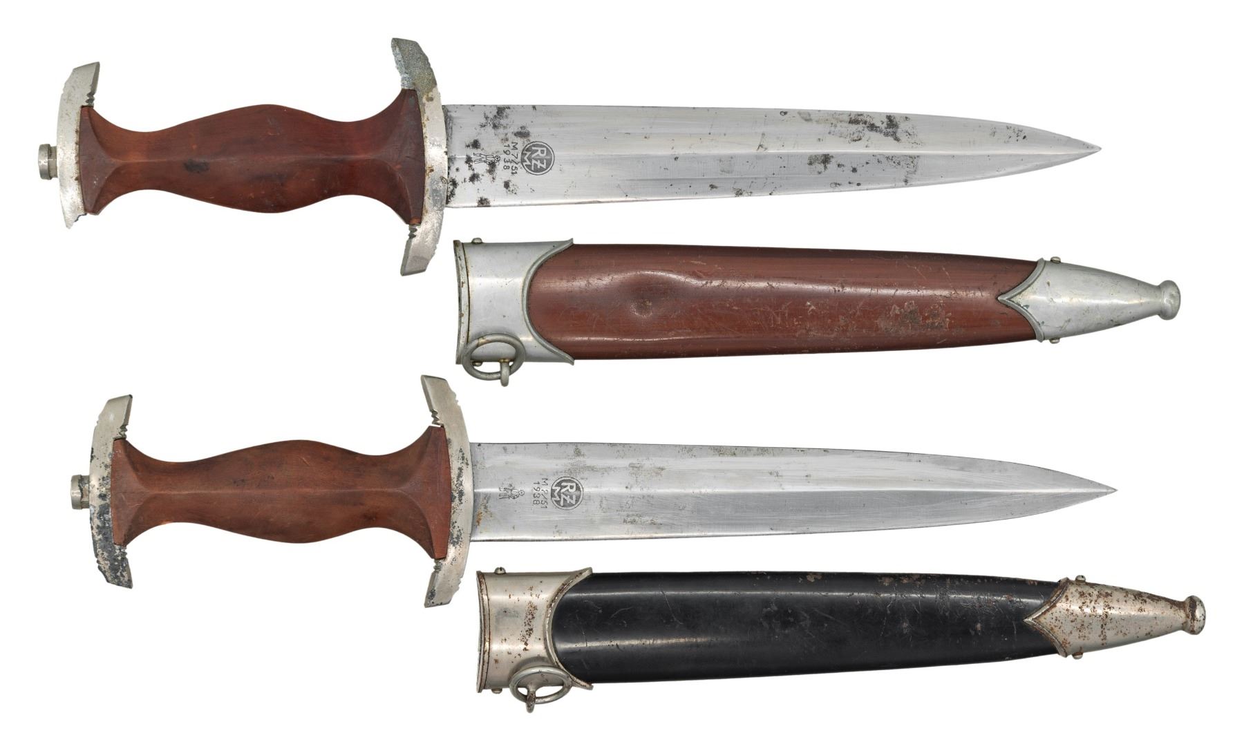 1) WWII German NSKK dagger measuring 15" overall with a blade that is etched "Alles fur Deutschland" and is marked "RZM M7/51 1938 (logo)" which indicates manufacture by Anton Wingen Jr. of Solingen. Plated cross guard and pommel guard. Brown wood grip with inset brown enamel SA button but eagle is missing. Black painted scabbard with plated mounts. CONDITION: blade has some minor staining. The crossguard and pommel guard have some finish loss. Grip is fine but no eagle. Scabbard finish is ok with finish loss on one side. 2) WWII German SA dagger measuring 14 3/4" overall with a blade that is etched "Alles fur Deutschland" and is marked "RZM M7/51 1938 (logo)" which indicates manufacture by Anton Wingen Jr. of Solingen. Plated cross guard and partial pommel guard. Brown wood grip with inset brown enamel SA button and eagle. Brown anodized scabbard with plated mounts. CONDITION: blade has significant staining. The crossguard has major loss of finish and the pommel guard is broken. The grip is quite good with very light wear. Scabbard a good finish with a few shallow dents and oxidation on the throat. (02-26119/BF). NON-GUN. $600-800.