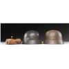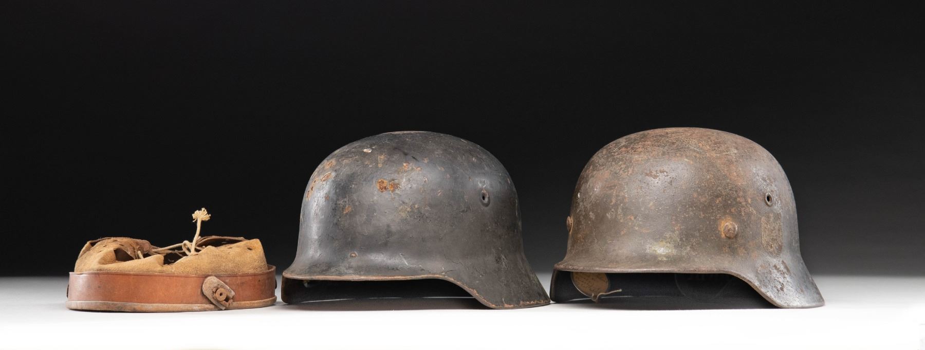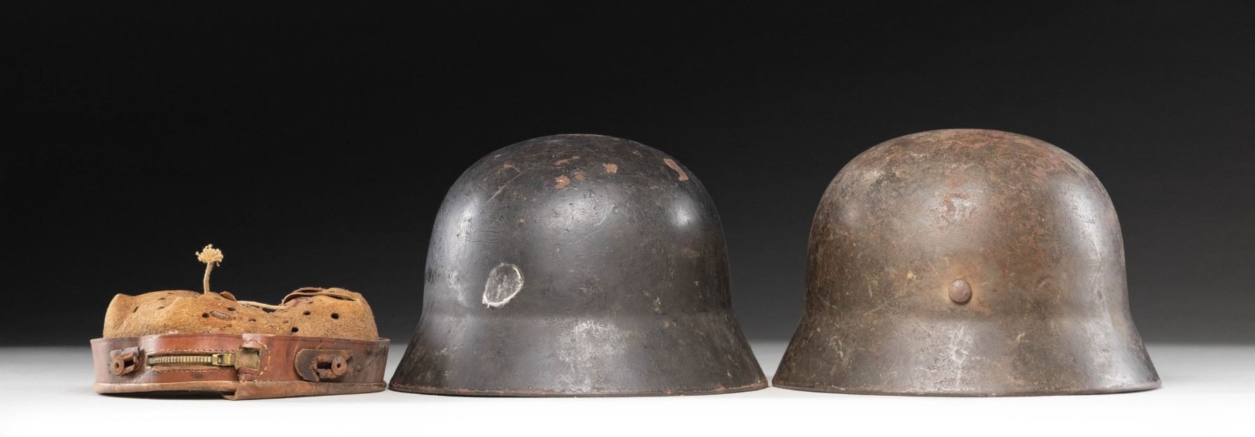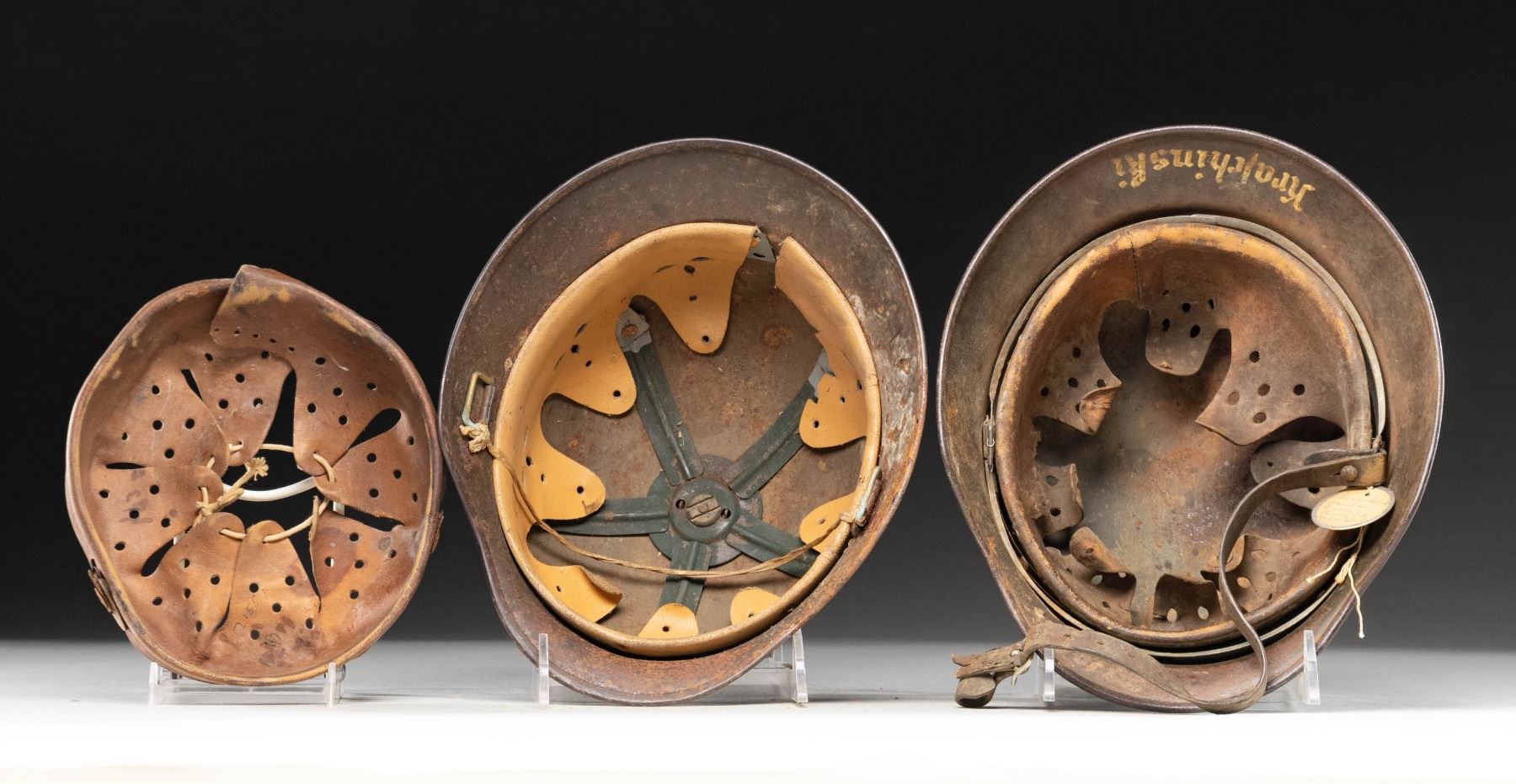 1) WWII German M1940 single decal Wehrmacht helmet with a dark green painted finish and a Wehrmacht eagle decal on the left side. The helmet is stamped on the inside rear "222_" and on the inside left "ET66". The name "Kraschinski" is written in white paint on the inside rear suggesting possibly a Ukranian or Belorussian volunteer; full liner and partial chinstrap. CONDITION: finish is about 60% and the decal is about 70%. The liner is quite dry and the chinstrap is broken on the left side. 2) An M1940 battle helmet with no decals and a dark gray/green finish. Possible post war liner and chinstrap links. No chinstrap. CONDITION: finish is 75-80% with an oxidized interior, liner shows light wear. 3) An original WWII German leather helmet liner. CONDITION: a bit dry but solid. (02-24220/BF). NON-GUN. $700-1,000.