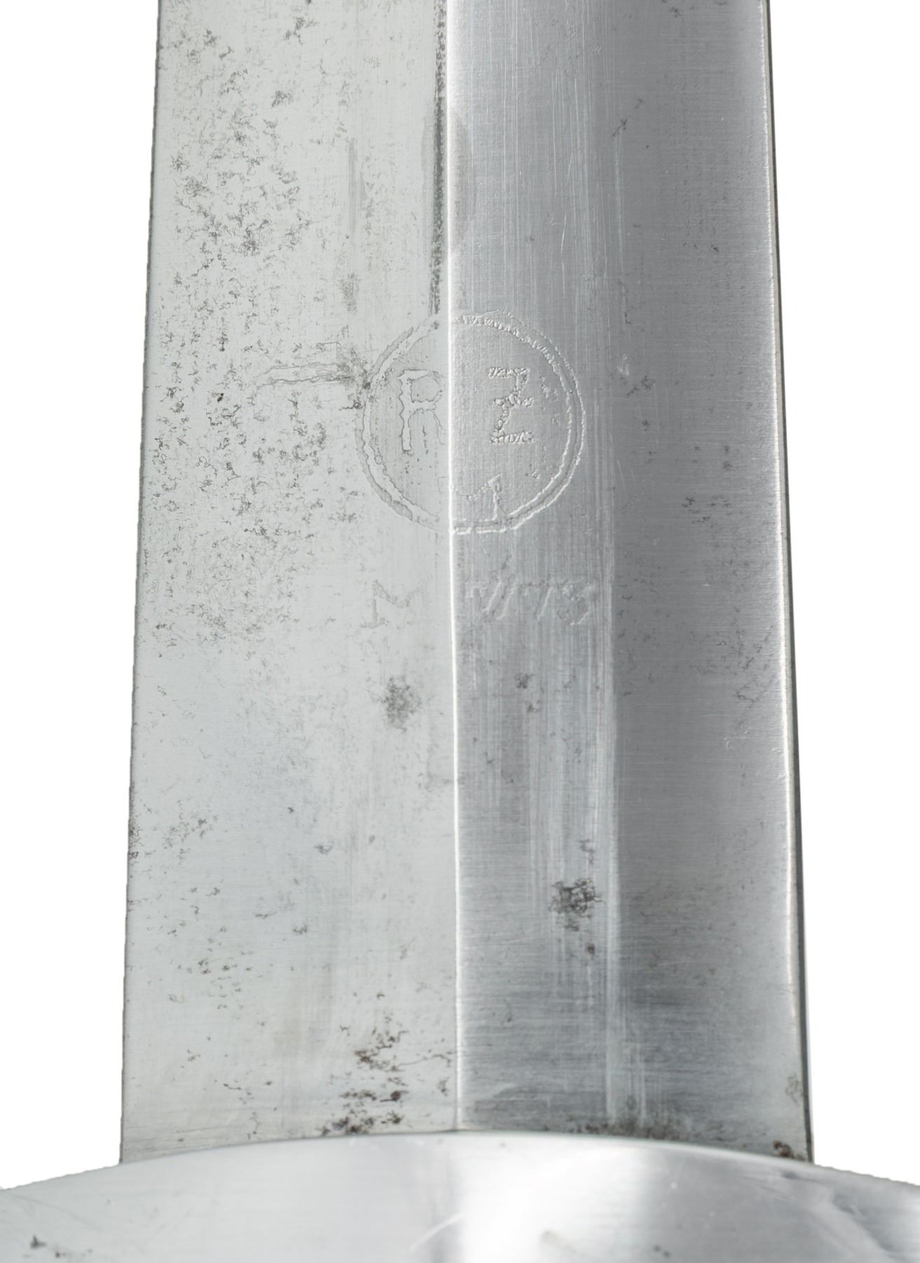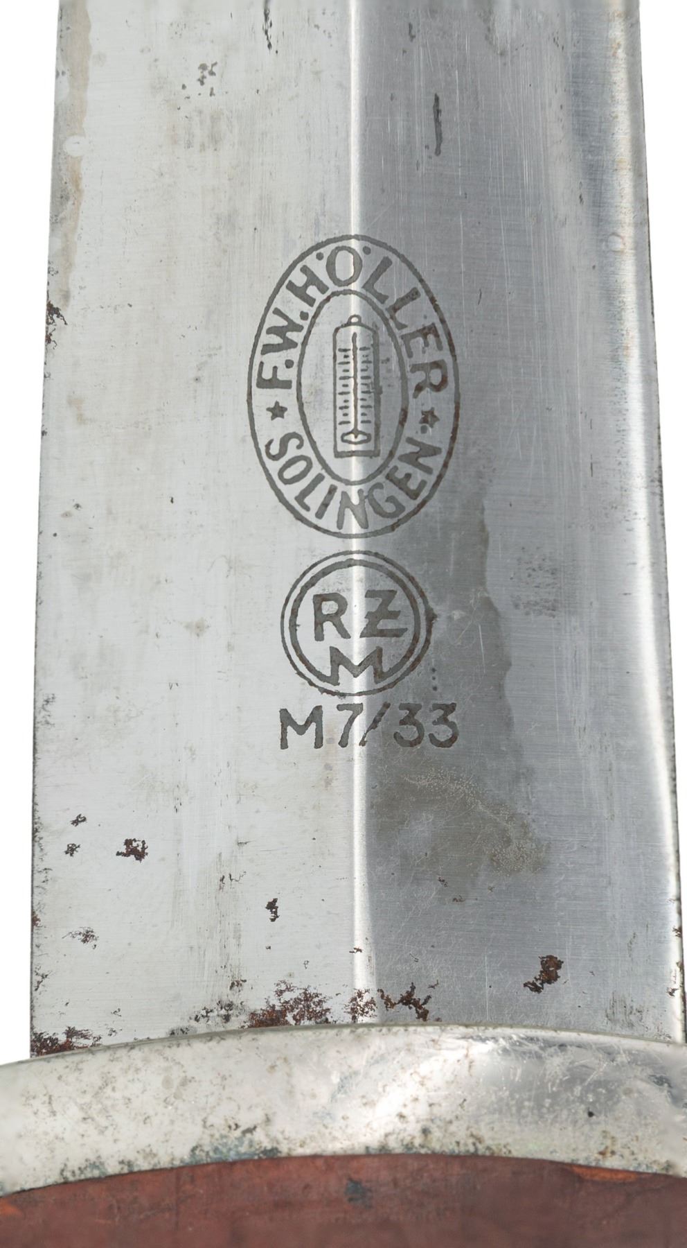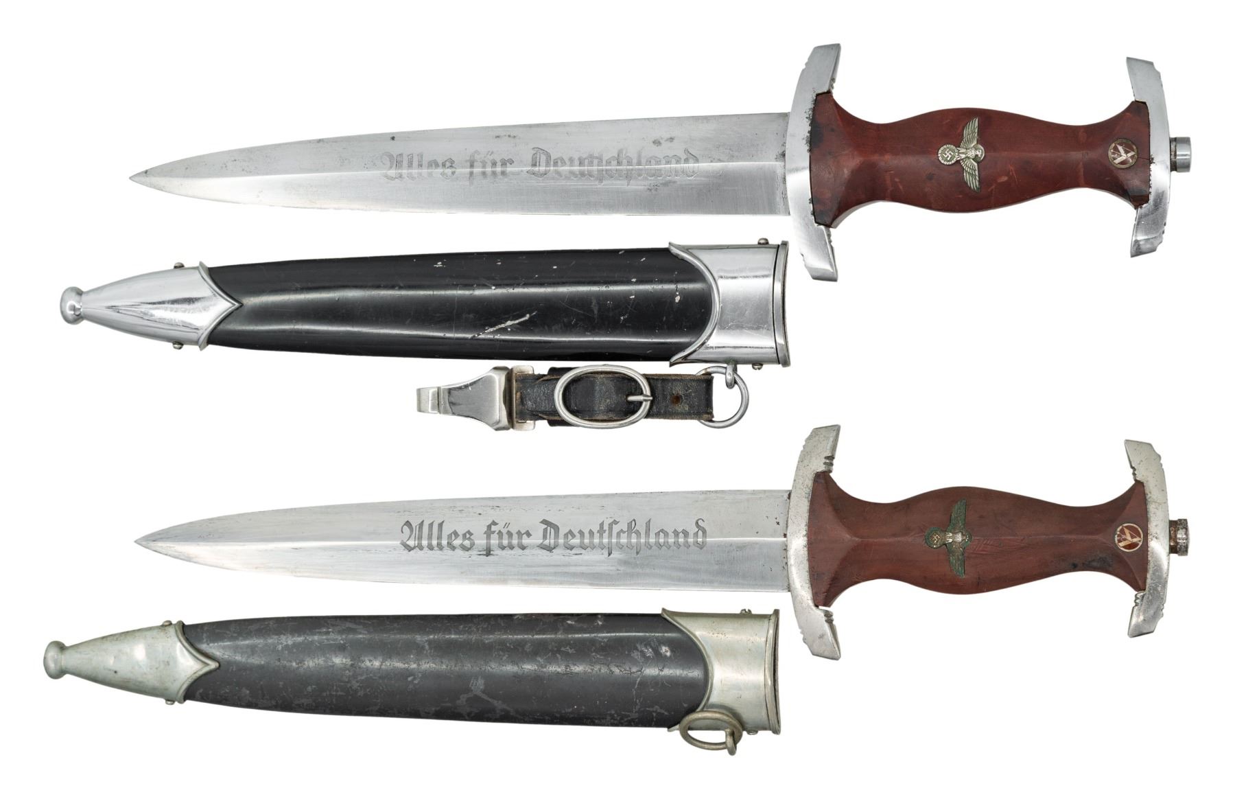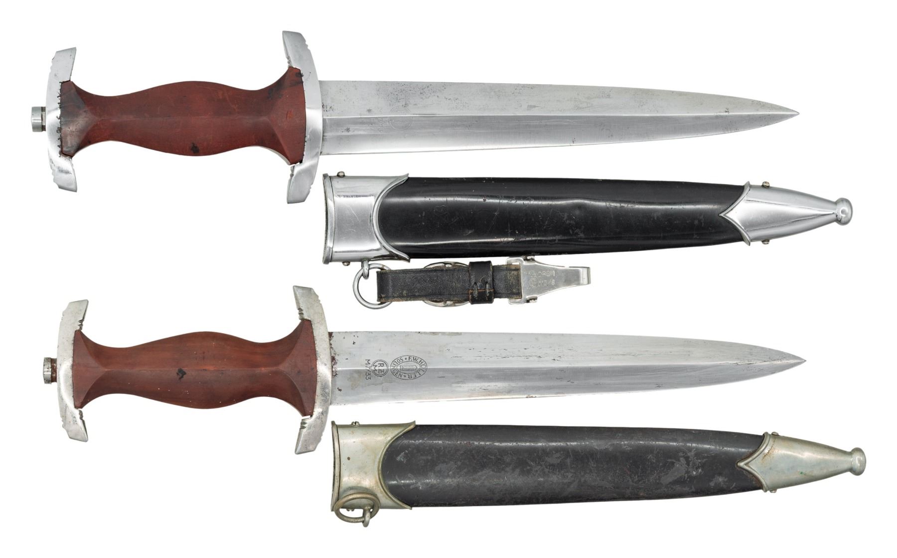 1) WWII German NSKK dagger measuring 14 3/4" overall with a blade that is etched "Alles fur Deutschland" and is marked "RZM M7/73" which indicates manufacture by F u. A. Helbig of Steinbach. Plated cross guard and pommel guard. Brown wood grip with inset brown enamel SA button and eagle. Black painted scabbard with plated mounts and original hanger. CONDITION: blade shows primarily scabbard wear. The crossguard and pommel guard have a polished finish. Grip is fine with light wear. Scabbard has very minor finish loss and the hanger shoes minimal wear. 2) WWII German NSKK dagger measuring 14 3/4" overall with a blade that is etched "Alles fur Deutschland" and is marked "F. W. HOLLER (logo) SOLINGEN" & "RZM M7/33". Plated cross guard and pommel guard. Brown wood grip with inset brown enamel SA button and eagle. Black anodized scabbard with plated mounts. CONDITION: blade shows primarily scabbard wear. The crossguard and pommel guard show light wear. Grip is fine with light wear. Scabbard has very minor finish loss. (02-26167/BF). NON-GUN. $800-1,100.