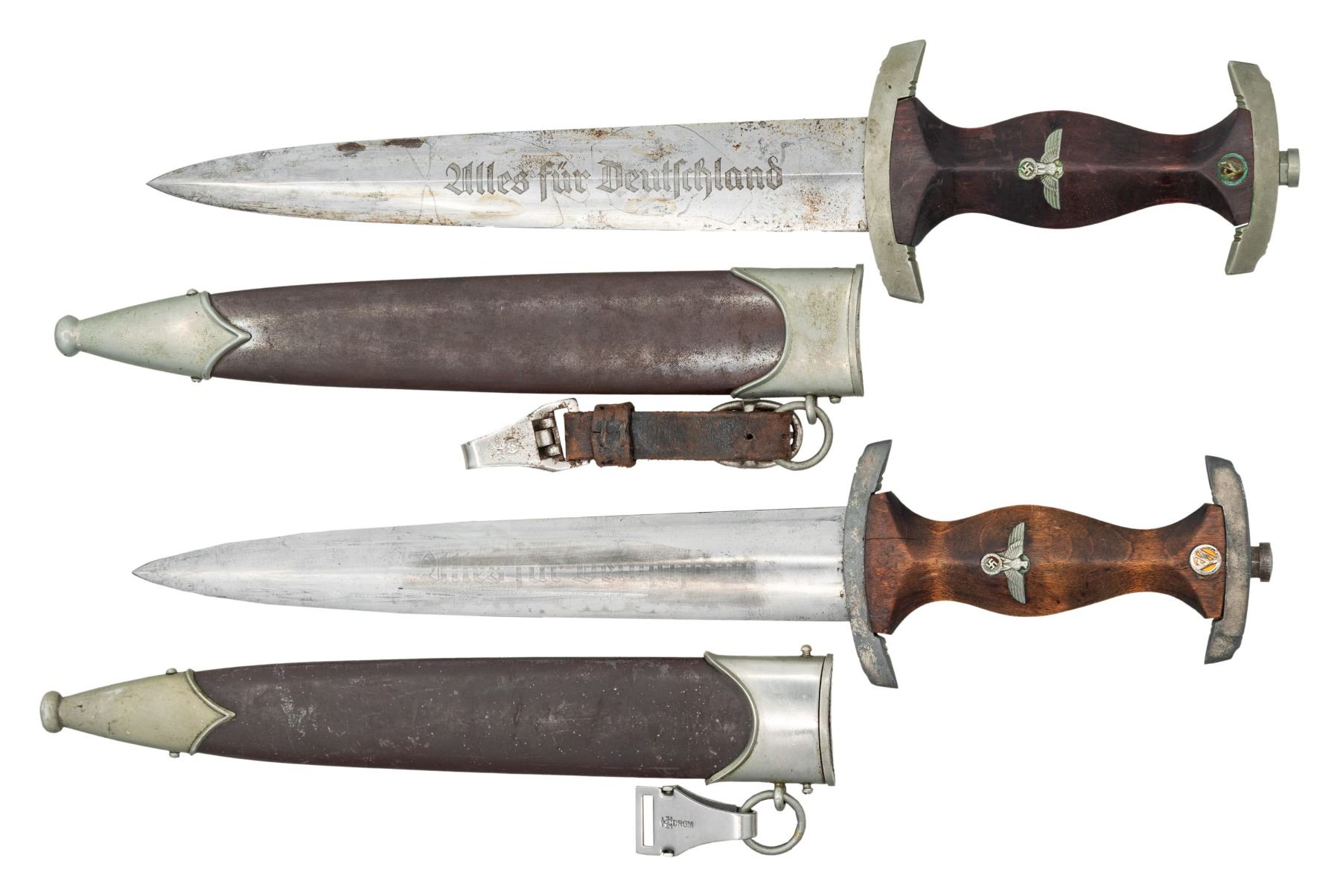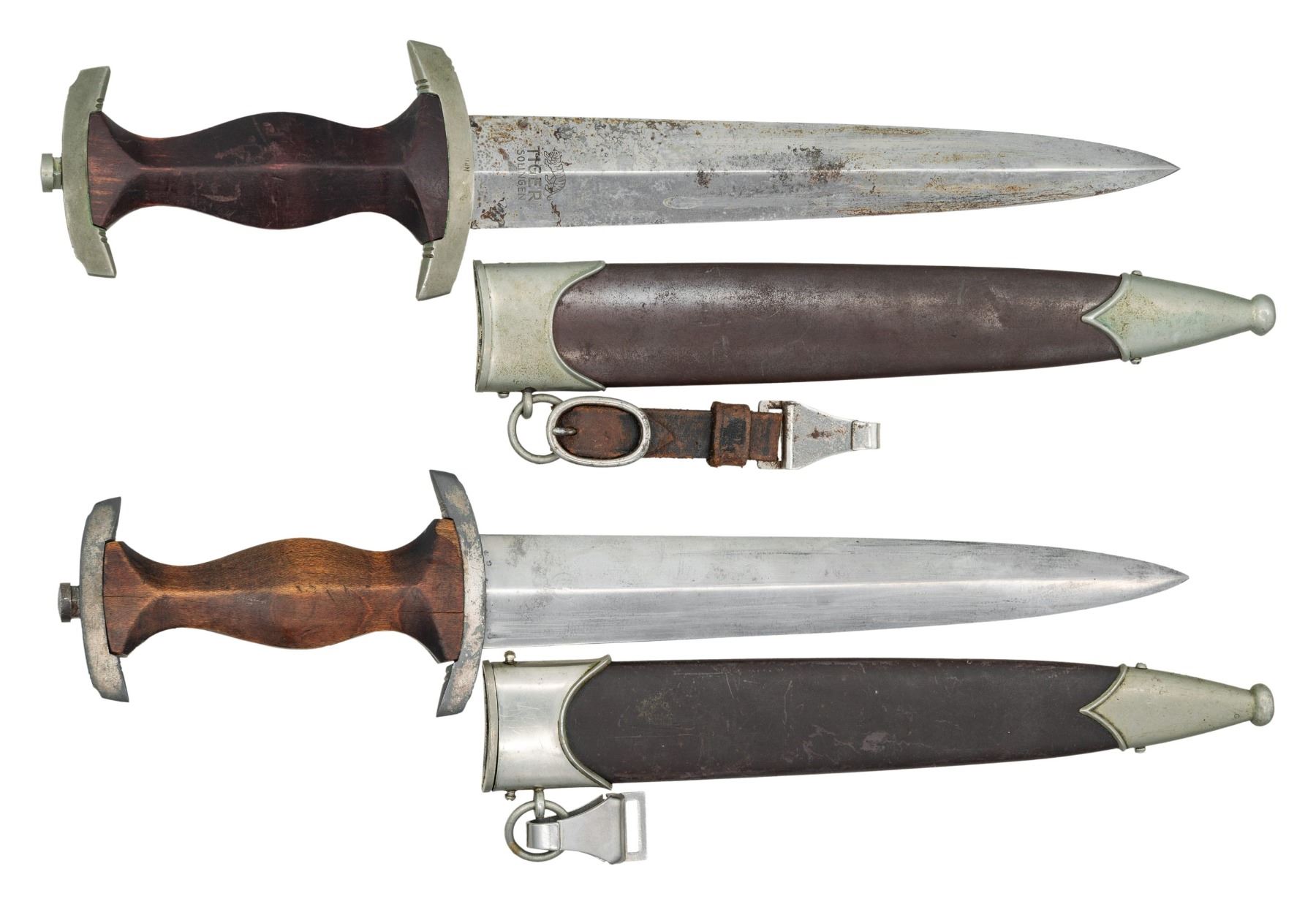 1) WWII German SA dagger measuring 14 7/8" overall with a blade that is etched "Alles fur Deutschland" and is marked "(logo) TIGER SOLINGEN". Nickel silver crossguard stamped "Nrh" for the group district of Niederbein and matching nickel silver pommel guard. Brown wood grip with inset brown enamel SA button and eagle. Brown anodized scabbard with nickel silver mounts and original hanger attached. CONDITION: blade has some staining but would benefit from a good cleaning. Hilt shows light wear and the grip is slightly scuffed. Scabbard finish is good with the slightest dent in one side. Hanger is solid. 2) WWII German SA parts dagger measuring 14 3/4" overall with a blade that is lightly etched "Alles fur Deutschland" and is marked "RZM M7/103" indicating manufacture by Josef Hack of Steyr. Plated crossguard and matching plated pommel guard. Brown wood grip with inset brown enamel SA button and eagle. Brown anodized scabbard with plated mounts and original hanger clip attached. CONDITION: blade has been buffed reducing the etching and almost erasing the RZM mark. Guards have lost nearly all of their plating. Grips do not fit well and the SA button appears to be fake, Scabbard is generally good but top screws have been replaced. (02-26166/BF). NON-GUN. $700-900.