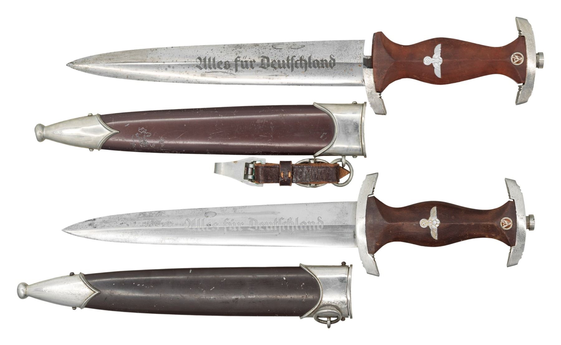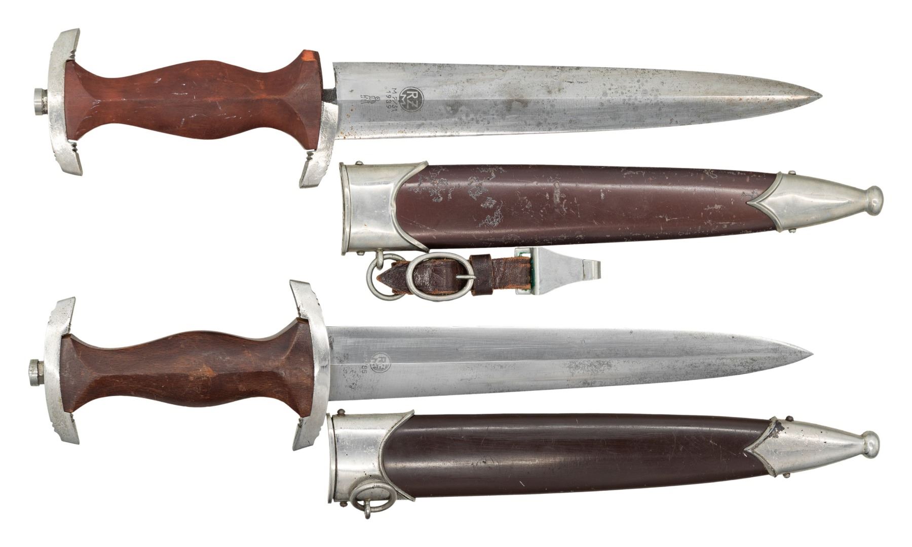 WWII German SA dagger measuring 15" overall with a blade that is etched "Alles fur Deutschland" and is marked "RZM M7/85" which indicates manufacture by Arthur Evertz of Solingen. Plated cross guard and pommel guard. Brown wood grip with inset brown enamel SA button and eagle. Brown painted scabbard with plated mounts. CONDITION: blade has some staining. Hilt shows light wear and the grip is very slightly scuffed. Scabbard finish is good. 2) WWII German SA dagger measuring 14 7/8" overall with a blade that is etched " Alles fur Deutschland " and is marked "RZM M7/51 1939 (logo)" which indicates manufacture by Anton Wingen Jr. of Solingen. Plated cross guard and pommel guard. Brown wood grip with inset brown enamel SA button and eagle. Brown painted scabbard with plated mounts and original hanger. CONDITION: blade has some minor staining. The crossguard is half missing and the grip has a small loss at the base. Scabbard finish is good with minor imperfections. Hanger is sturdy. (02-26168/BF). NON-GUN. $700-900.