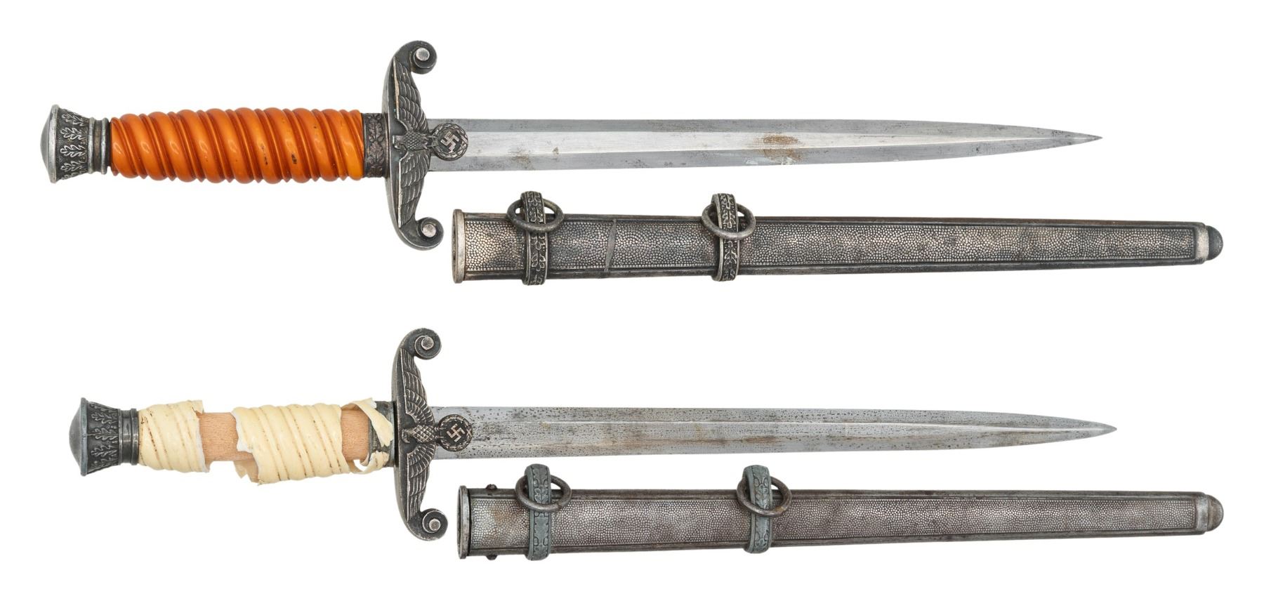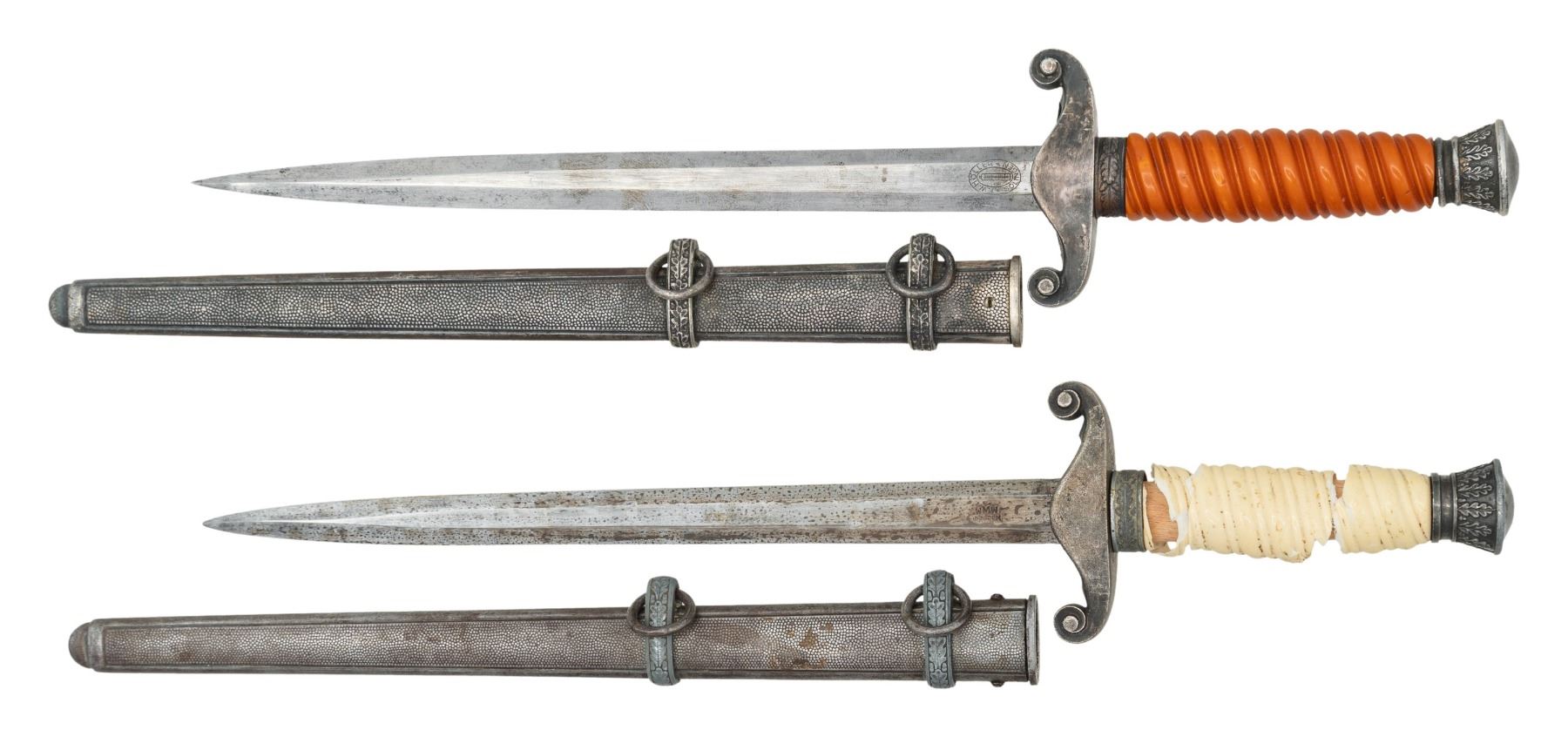 1) WWII German Army dagger measuring 15 3/4" overall with a plain blade marked "F. W. HOLLER (logo) SOLINGEN". Plated eagle crossguard with oak leaf embellished pommel and ferrule. Dark orange grip and a plated scabbard. CONDITION: blade has a few dark spots but would improve with cleaning. Mounts show heavy tarnish. Grip is undamaged. Scabbard is sound with substantial tarnish and minor oxidation. 2) WWII German Army dagger measuring 15 3/4" overall with a plain blade marked "WMW WAFFEN". Plated eagle crossguard with oak leaf embellished pommel and ferrule. Cream colored grip and a plated scabbard. CONDITION: blade has a light gray patina. Mounts show dark tarnish and some loss of plating. Grip is damaged and in pieces. Scabbard is sound with a gray patina. The top suspension ring is a bit loose. (02-26164/BF). NON-GUN. $500-750.