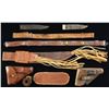5) Large brown leather tooled sheath for 14" long & 2" wide blade. tooled leather has floral motifs & stamped "PANAMA". CONDITION: Fair overall w/ wear & flexing leather. Belt loop has small tears.