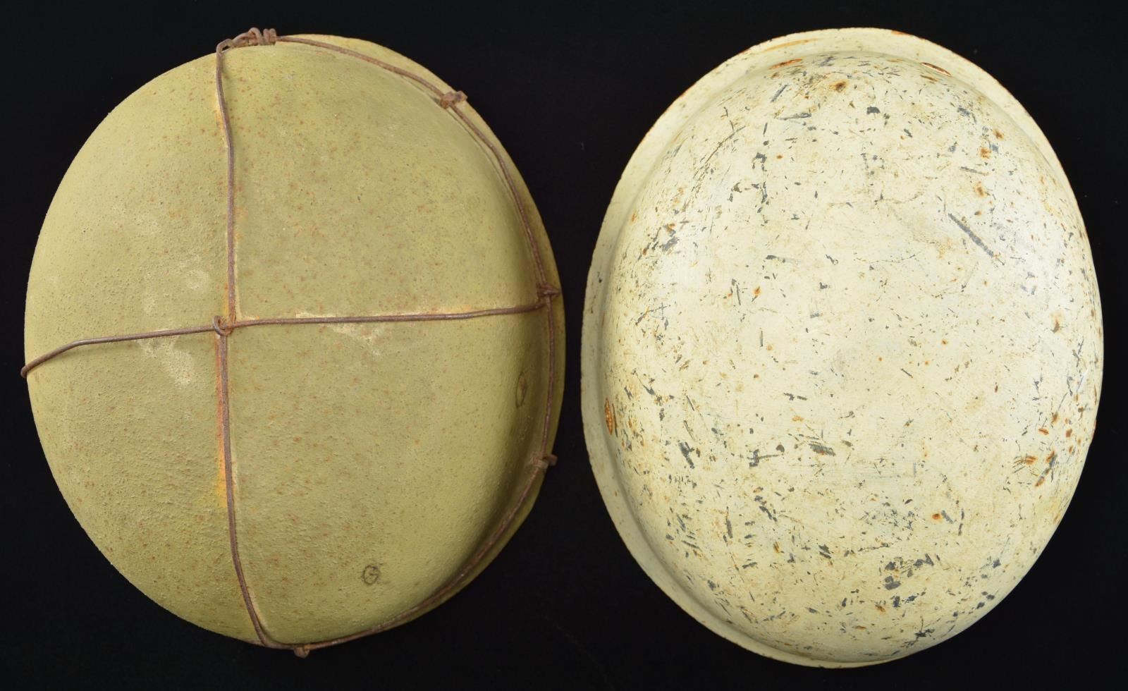 2) This helmet has been overpainted in a greenish tan color and there is no decal visible. There is iron wire surrounding the helmet and clipped to the base. Interior numbers cannot be seen due to oxidation. The cream colored liner is stamped “Kopfweite Gr. 59” & “Stahlhaube Nr. 71”. The harness appears to be a gray finished leather backed with a brown sueded leather. CONDITION: helmet shows significant enhanced wear with heavy oxidation around the lower rim. Harness & liner show light to moderate wear. (02-18114-2/BF). $800-1,500.