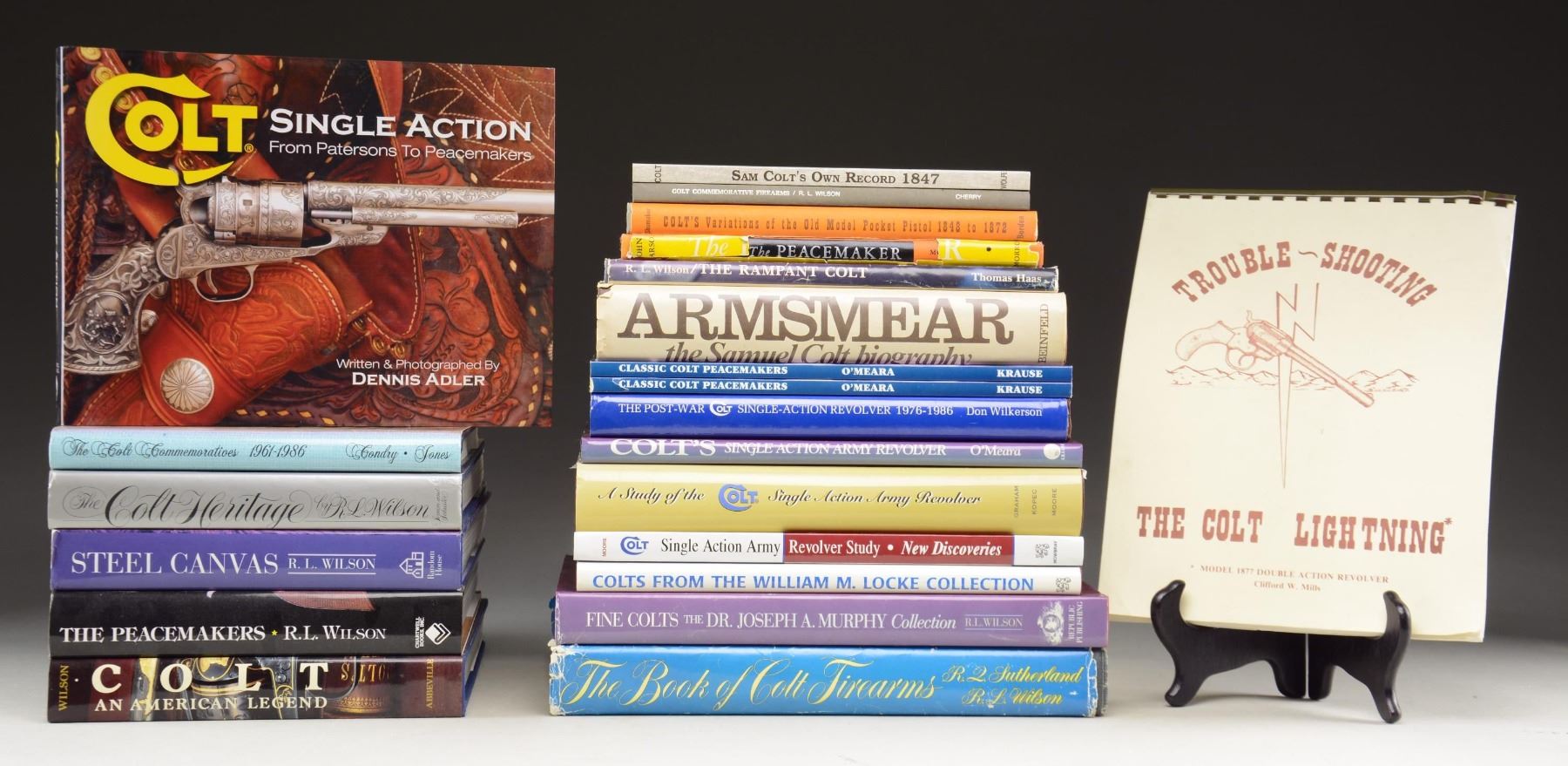 A varied lot of reference books about Colt firearms. Lot includes, but not limited to: The Colt Commemoratives 1961-1986 by Condry. The Post War Colt Single-Action Revolver 1976-1986 by Don Wilkerson. A Study of the Colt Single Action Army Revolver, A Thirty Year Anniversary Edition. CONDITION: books in good overall condition showing wear & tears. PROVENANCE: The Collection of Gun Sport Ltd owned by Jon R. Thomas. (02-20606-26/MD). $200-400.