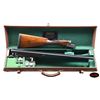EJECTOR GAME GUN WITH CASE. Cal. 20 Ga. 2-3/4". S# 8276 (1972). The 25" dovetailed barrels are fitted with matted Churchill rib. "XXV" is in gold at breech end. Maker's name and Orange St. address is engraved on tops of barrels. Barrel flats are stamped with Birmingham nitro proofs for 2-3/4" chambers. S#'s are on bottom of barrels. Case hardened double ogee backed boxlock action features non-automatic safety ("SAFE" inlaid in gold) and double triggers. Action is engraved with 70% coverage well cut scroll with some rose accents. "CHURCHILL" is in scrolled device on each side. Blued floorplate is engraved "THE" "REGAL" surrounded by matching scroll. Blued trigger guard with scroll and roses on bow has S# on tang. Straight grip buttstock of relatively plain European walnut measures 14-3/8" over black Decelerator pad. Stock features drop points, point pattern checkering and vacant silver oval. Matching splinter ejector forend has Anson release. MEASUREMENTS: BBLS: Bore Diameter: L .619. R .616. Restriction: L .012 (mod). R .004 (IC). Wall thickness: L .026. R .029. STOCK: DAH: 2-3/8". DAC: 1-1/2". CAST: about 1/2" off. LOP: 14-3/8". WEIGHT: 5 lb. 7 oz. UNATTACHED ACCESSORIES: gun is housed in a brown canvas "VC" case with stitched leather corners and is lined in green cloth. A black leather Churchill label is in lid. Case contains cleaning equipment along "A&F" marked oil bottle and snap caps. CONDITION: very fine. Barrels retaining over 95% blue. Action with 85% case color. Stocks retain nearly all of their original finish with a few minor marks. Pad is relatively new. Bores are bright and shiny. Action is tight. Ejectors are strong and in time. Case is very good with rubs and marks on exterior. Straps and handle are good. Interior cloth is good with some re-working. Accessories are good. A dynamic lightweight gun. PROVENANCE: from the renowned collection of quality sporting arms from Lewis Drake together with inventory of Lewis Drake Associates. (24-6586/MGM). CURIO. $3,000-5,000.