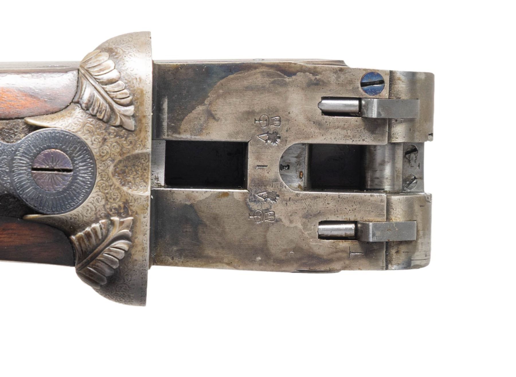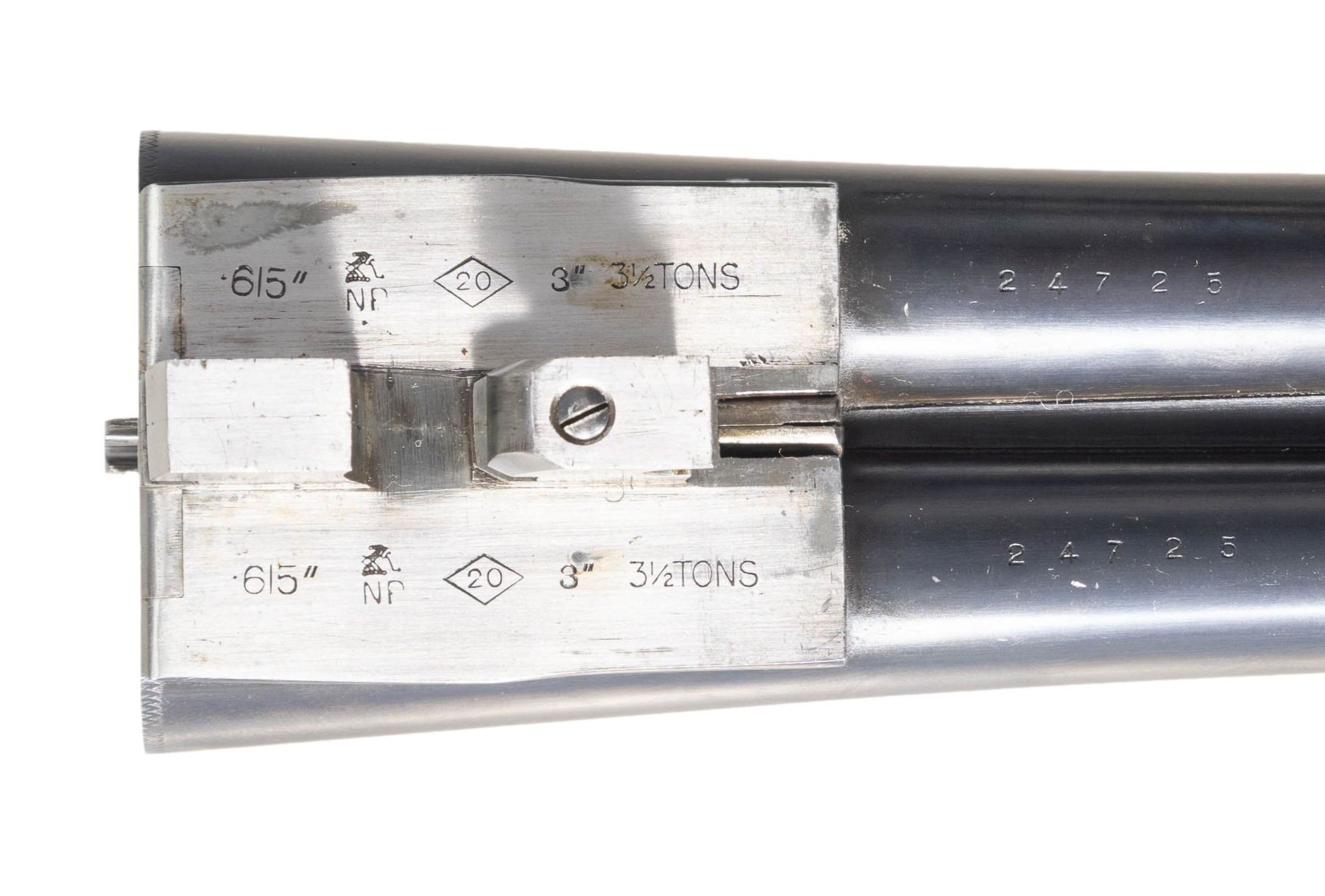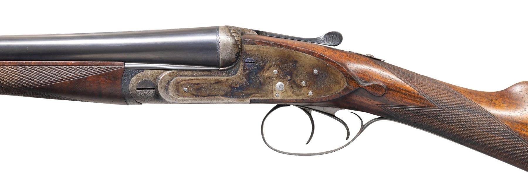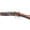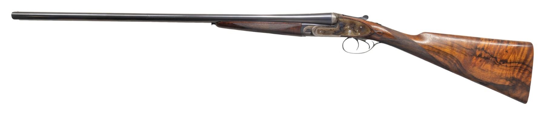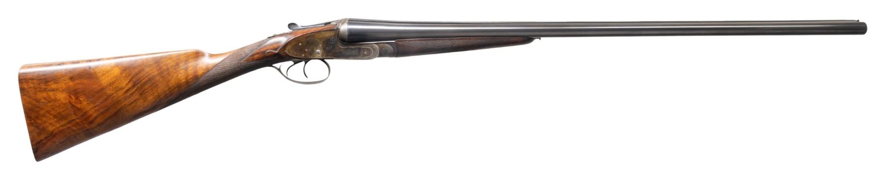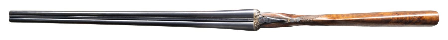 OPENING GAME GUN. Cal. 20 Ga. 3" magnum. S# 24725 (ca 1932). The 26" chopper lump barrels are engraved "J. Purdey & Sons Audley House South Audley Street. London. England" on very narrow swamped game rib. Barrel flats are stamped with London nitro proofs for 3" chambers at 3-1/2 tons. Barrels were made before 1972 as there is no date mark. Bottoms of barrels are stamped with S#s however, there are no Purdey markings or barrel maker's initials. Tube numbers "34327" & "34328" are on loop. Small size Beesley patent self-opening sidelock action features automatic safety (SAFE" inlaid in gold), hidden third fastener, bushed strikers, arrowhead tumbler end cocking indicators and double triggers. Action is filed in traditional manner with the exception of special order relief carved foliate fences as found on some Purdey guns dating from the early 1900's. Action and lockplates are engraved with traditional Purdey house style rose and scroll. Maker's name is on each lockplate. Bottom of action is engraved "Purdey's Patent". Top lever is engraved "PATENT". Trigger guard is also scroll engraved; S# is on tang. Straight grip buttstock made of very nicely marbled and somewhat stump figured European walnut measures 14-3/8" over checkered wood butt and features standard drop points, point pattern grip checkering and silver oval on toeline engraved with monogram "PCF" (?). Matching splinter new style ejector forend with Anson release has S# newly stamped and is not marked with actioner's initials. MEASUREMENTS: BBLS: Bore Diameter: L .613. R .614. Restriction: L .014 (mod). R .007 (IC). Wall thickness: L .026. R .018. STOCK: DAH: 2-1/4". DAC: 1-1/2"-. CAST: about 5/8" off. LOP:14-3/8". WEIGHT: 5 lb. 11 oz. CONDITION: very fine as reconditioned probably in the 60's. Barrels, forend and trigger guard appear to post-date the action and retain most of their original finishes (trigger guard considerably silvered on tang). Action retains about 90% of a re-color with engraving somewhat softened especially around bottom and on safety. Later scroll engraving appears on forend iron and trigger guard which does not match original quality. Buttstock appears to be original with wood slightly under metal at bottom of action and retains most of its good quality refinish. Checkering cleaned. Bores are bright and shiny. Action is tight; barrels are on face. Right ejector is live. (25-5226/MGM). CURIO. $8,000-12,000.
